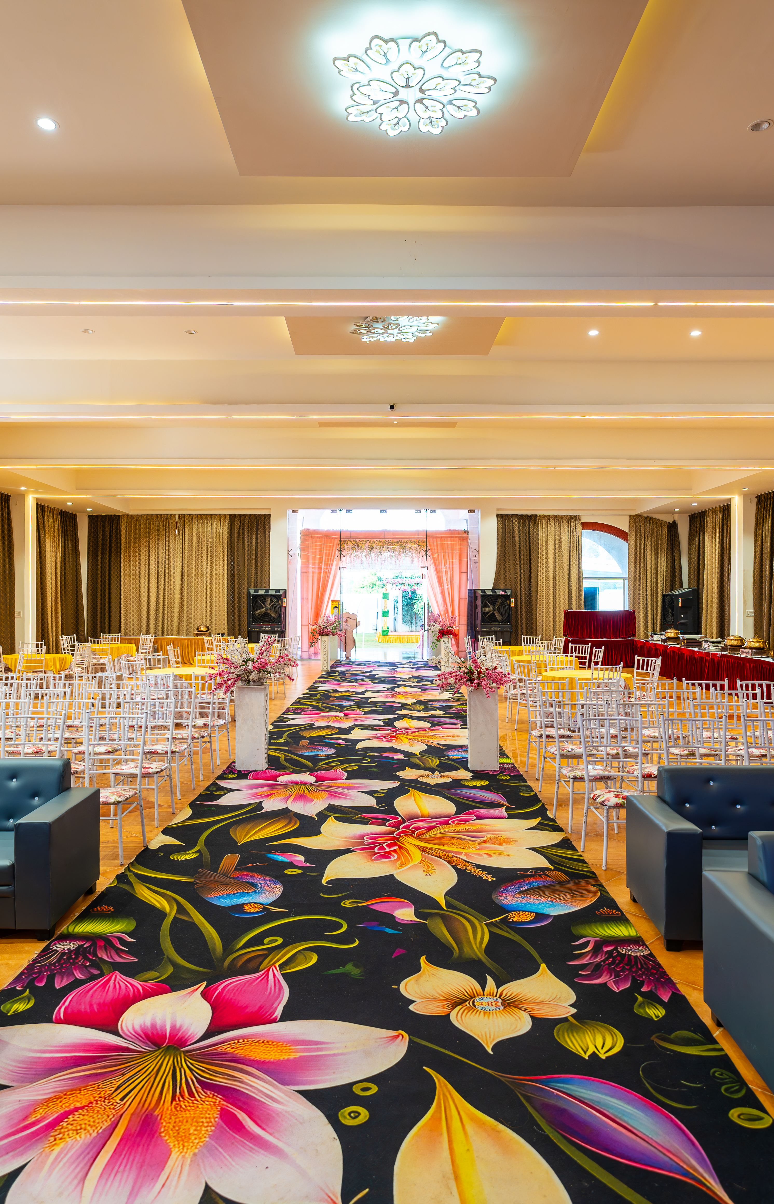 A grand central aisle designed to create a strong visual entry, leading guests seamlessly toward the stage.