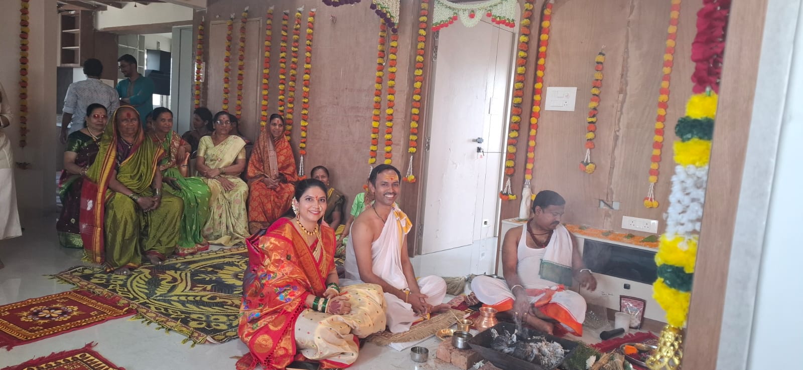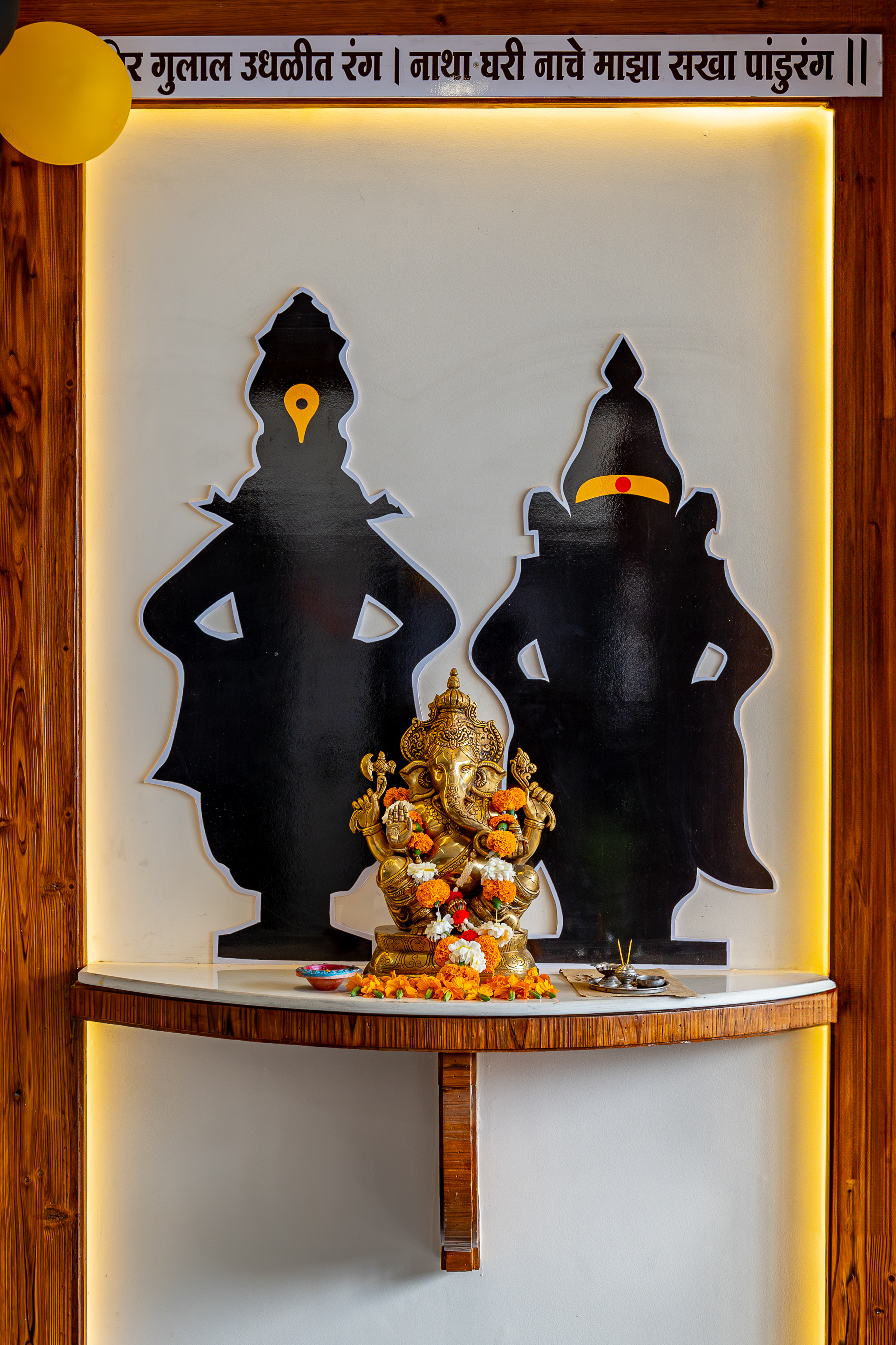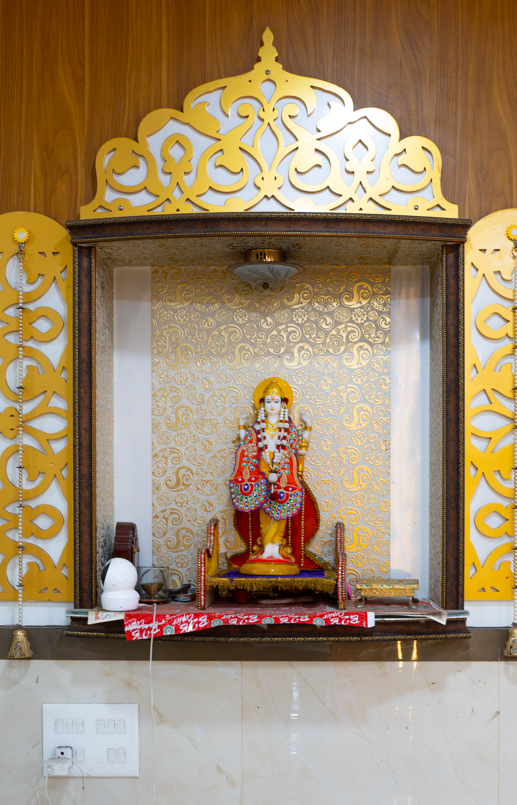 A thoughtfully crafted mandir with intricate detailing, creating a peaceful and spiritual focal point within the home.