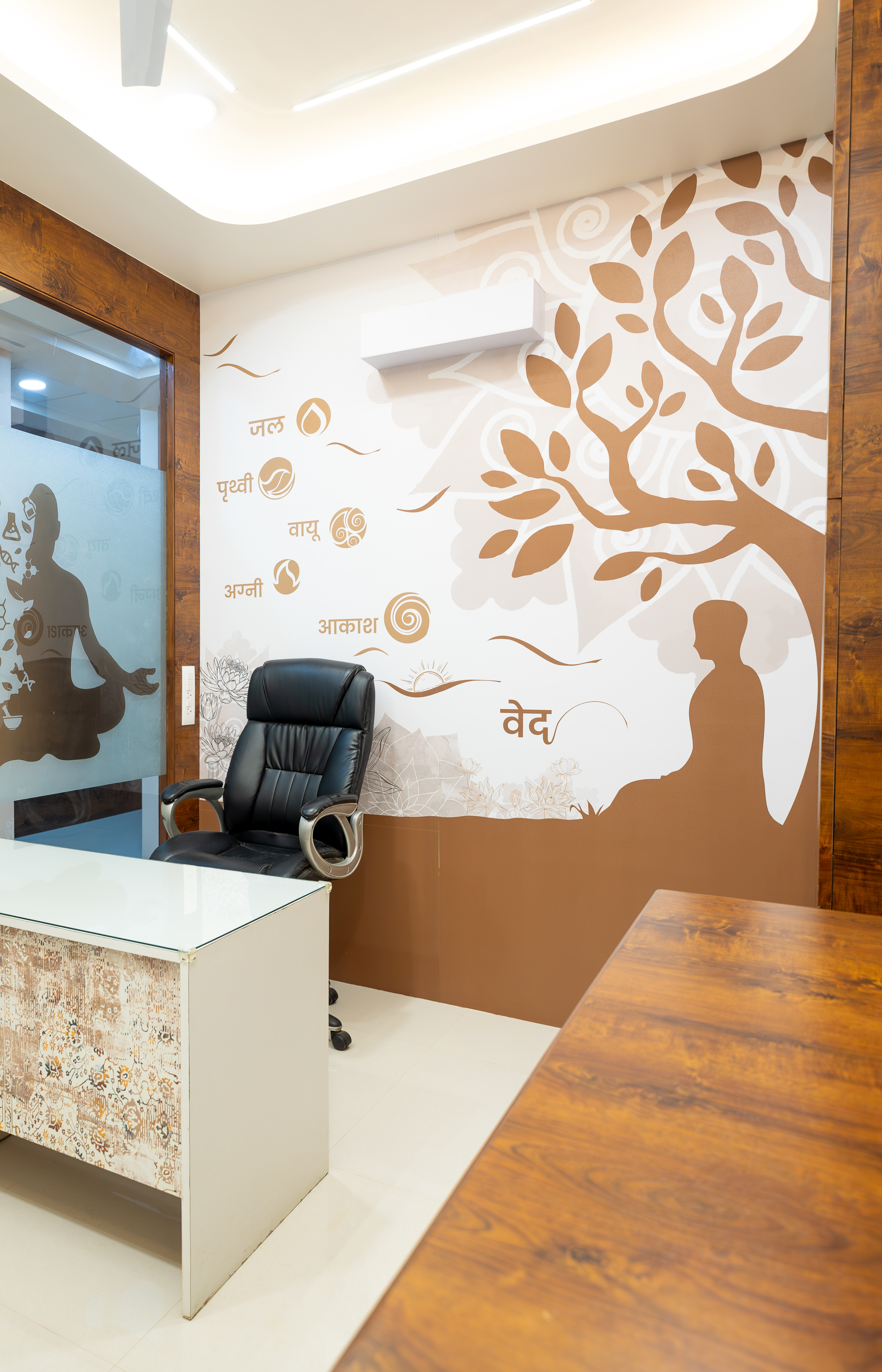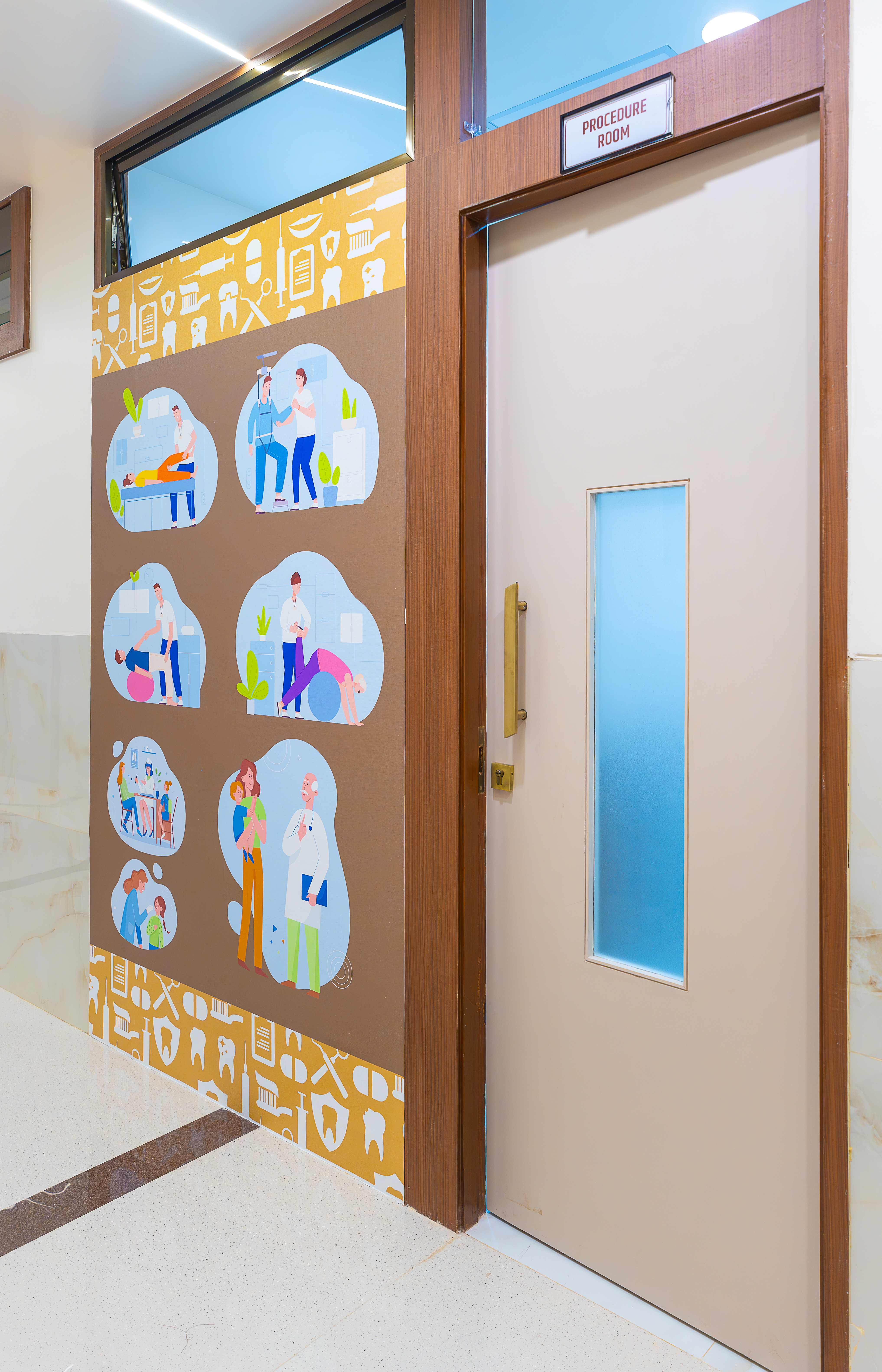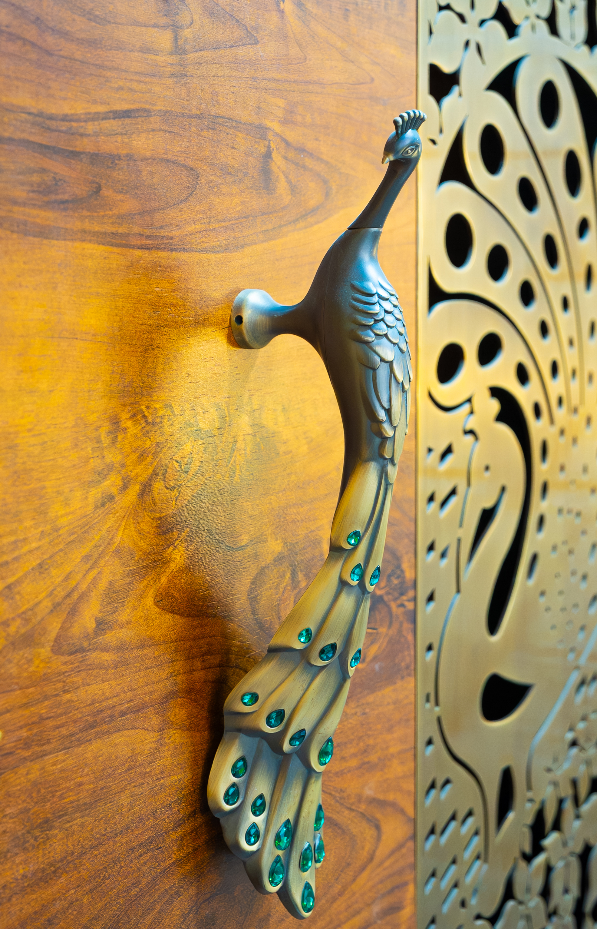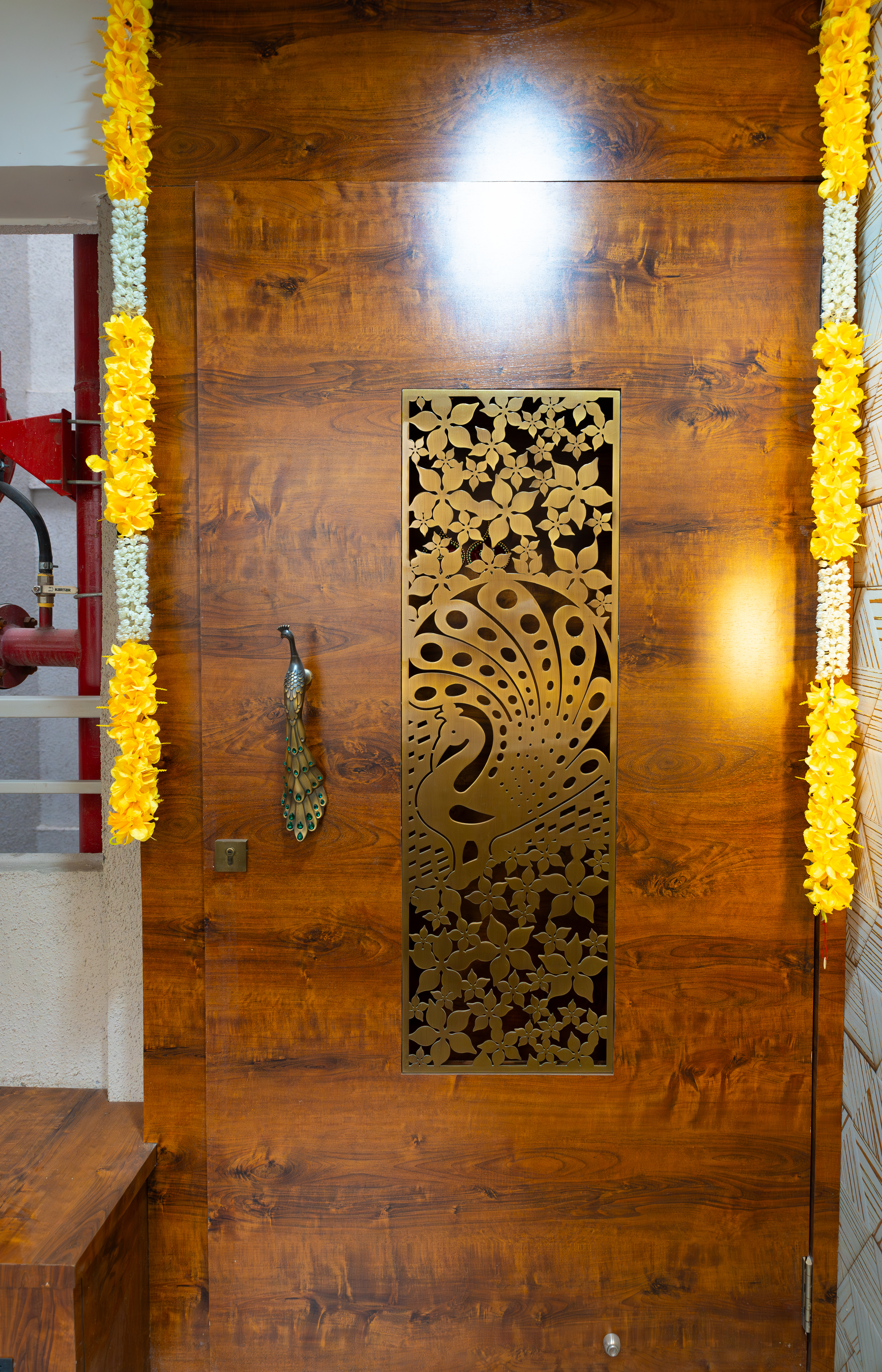 A custom-designed main door with intricate panel work, adding character and a strong first impression.