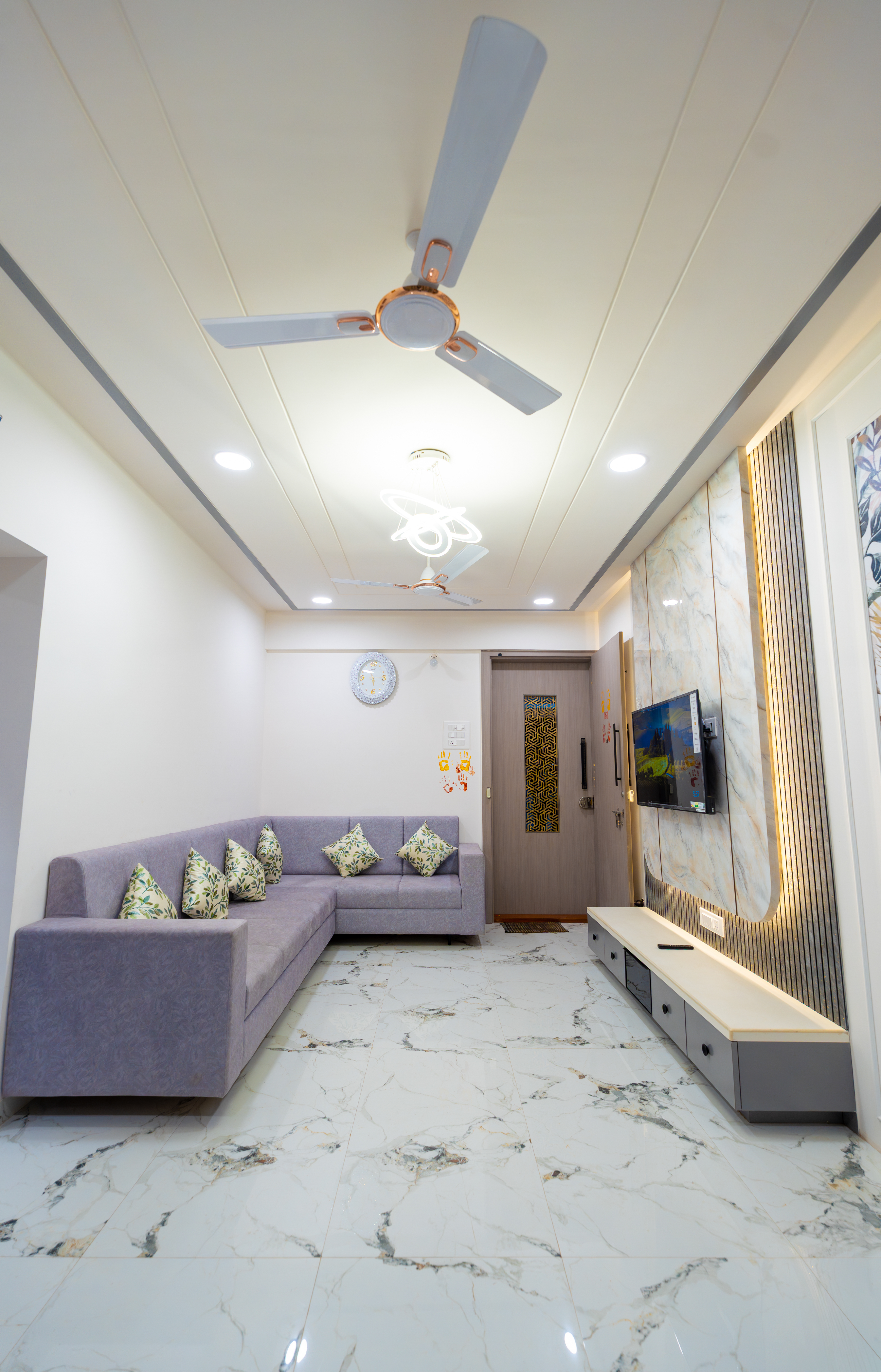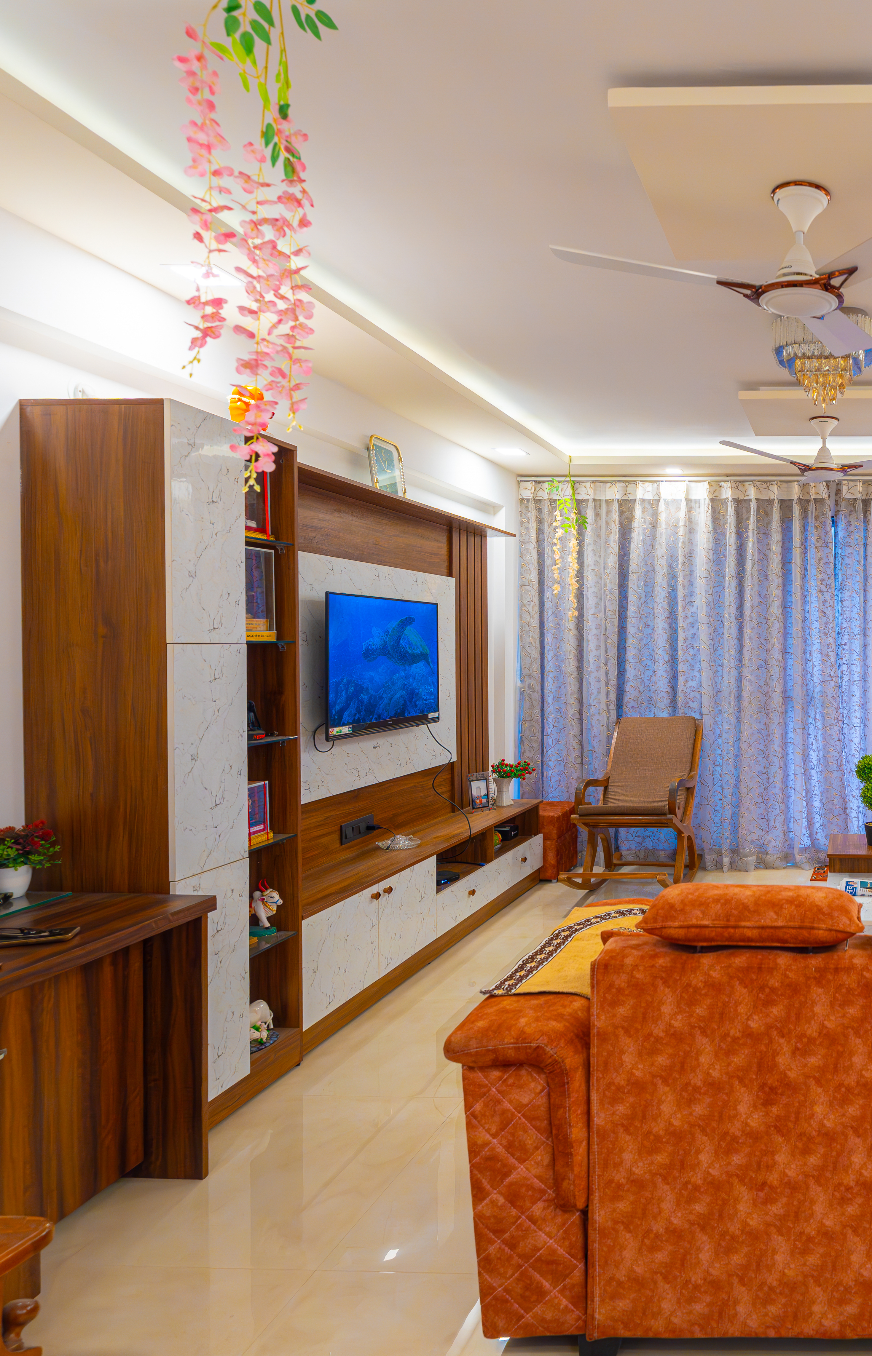 A refined TV unit with marble-finish backdrop and subtle lighting, adding a premium focal point to the living area.