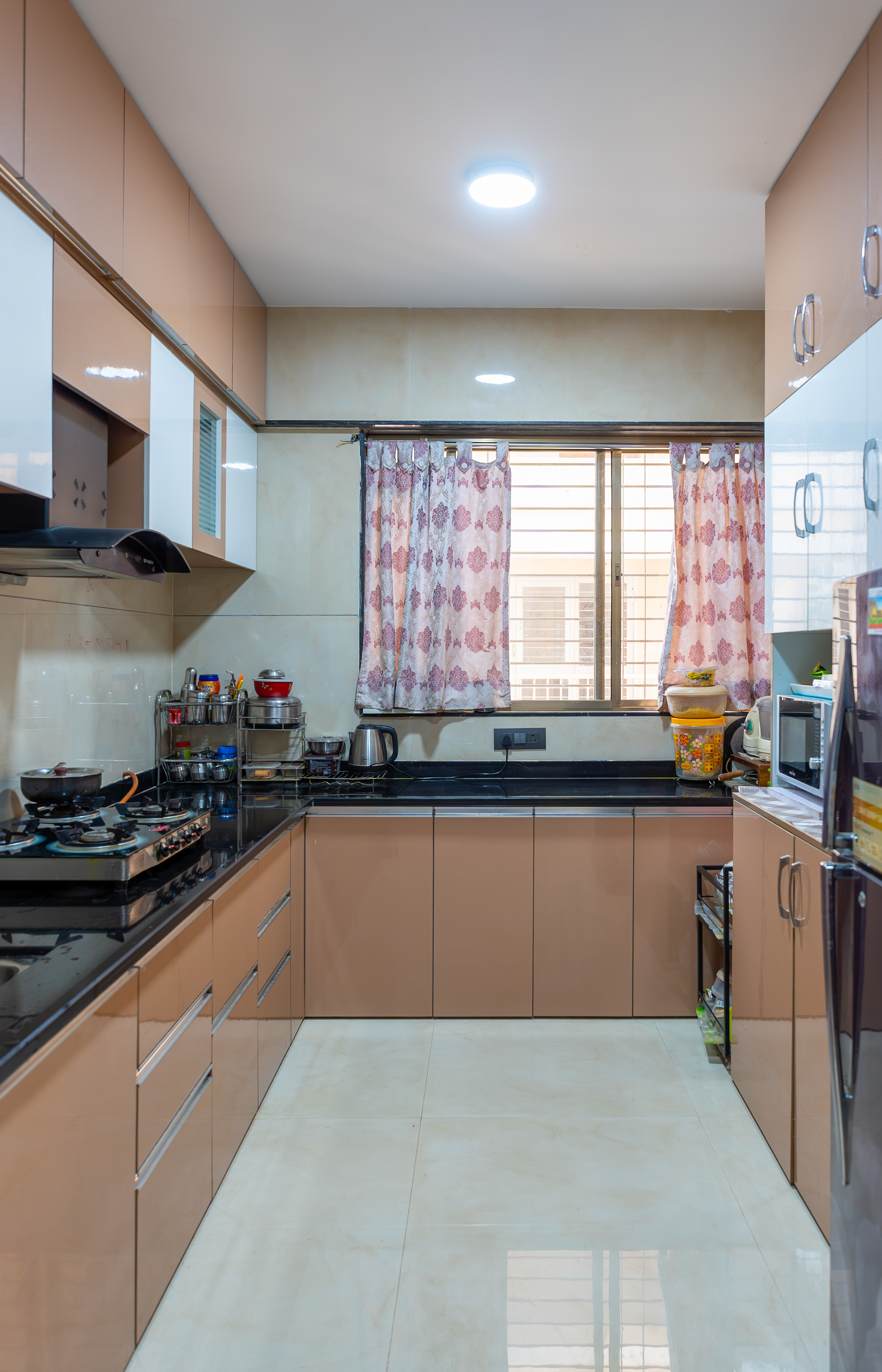 A sleek modular kitchen with efficient layout and clean finishes, designed for practical daily use.