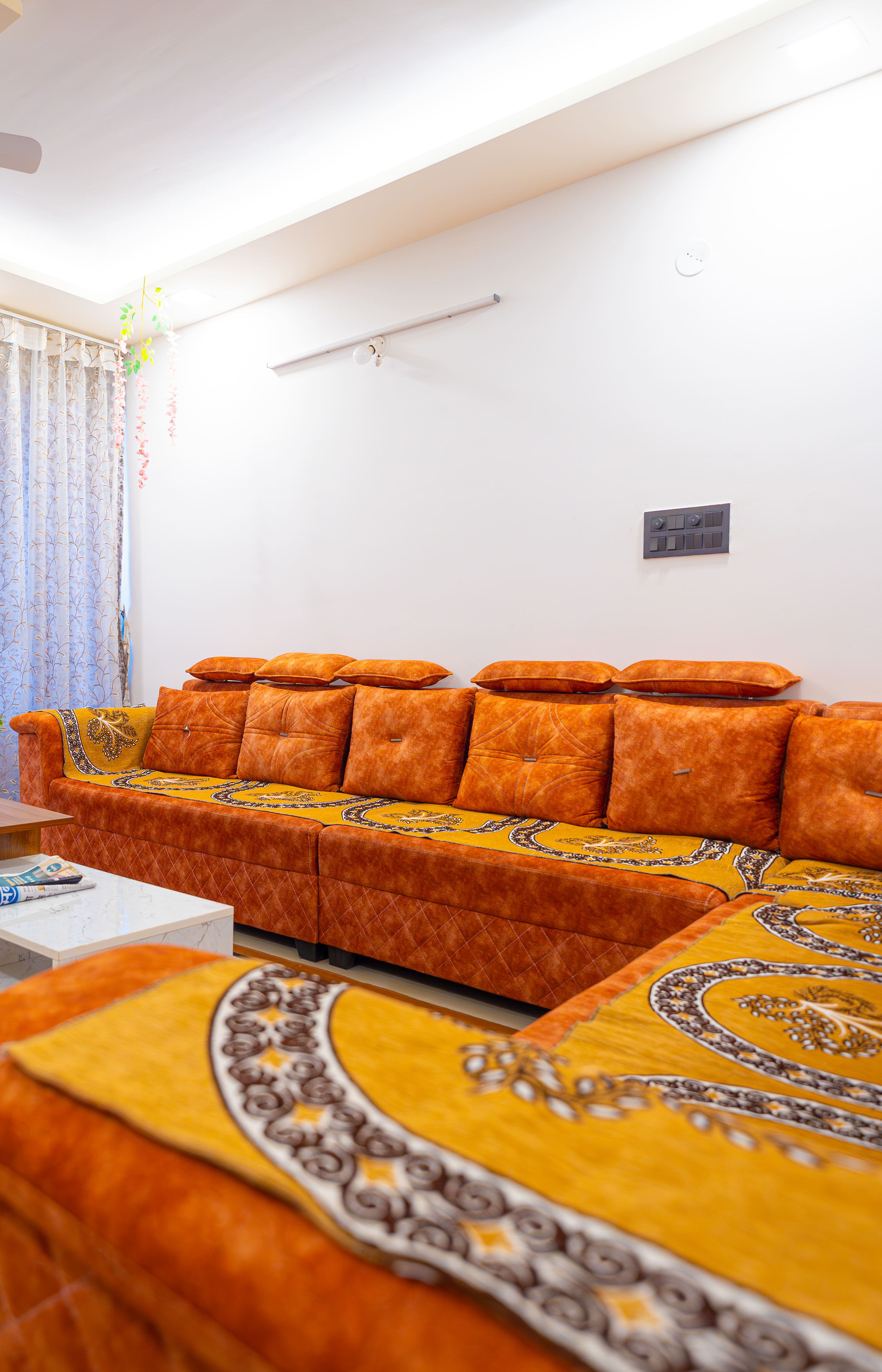 A spacious seating arrangement that balances elegance and openness for everyday and guest use.