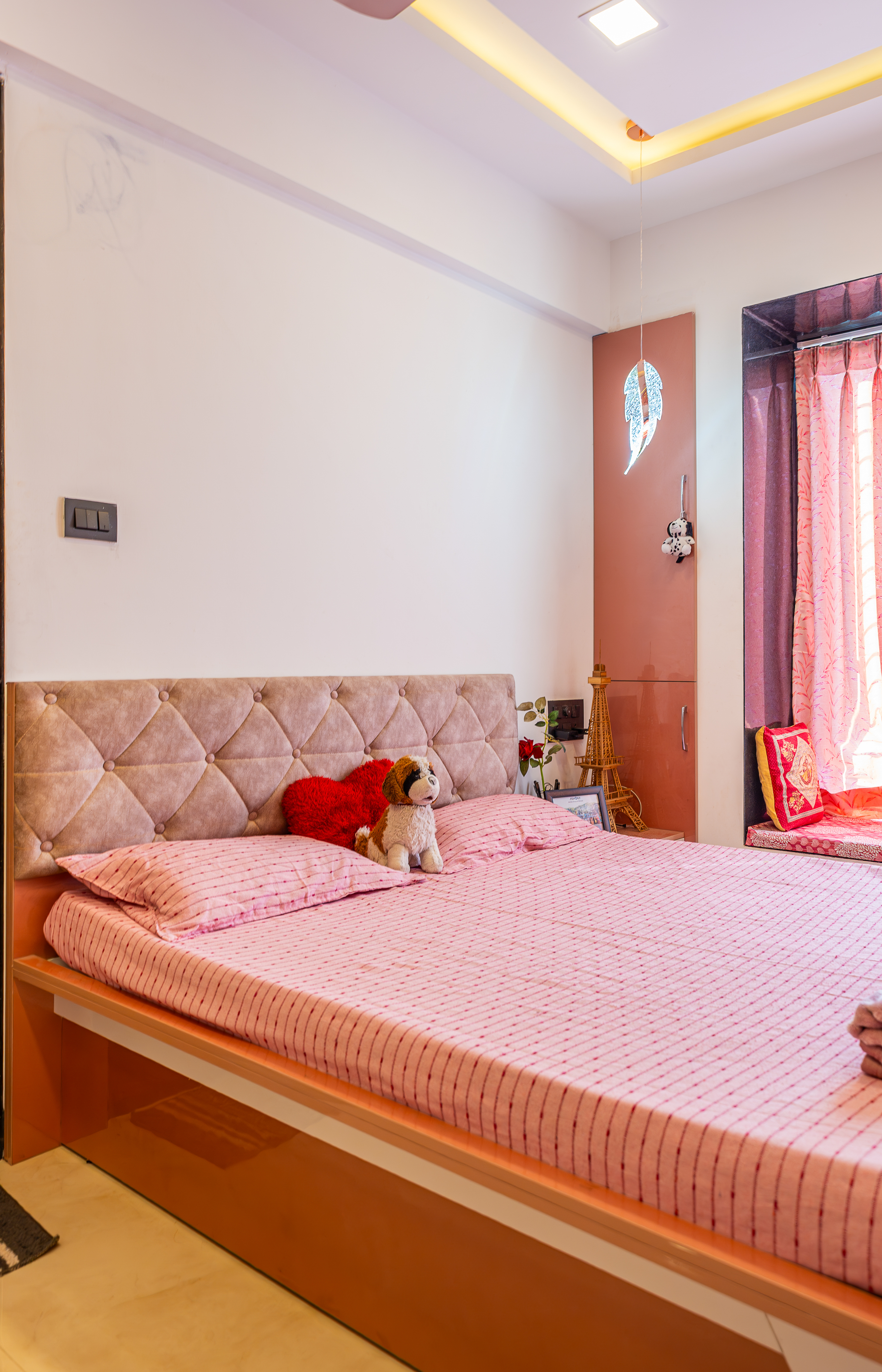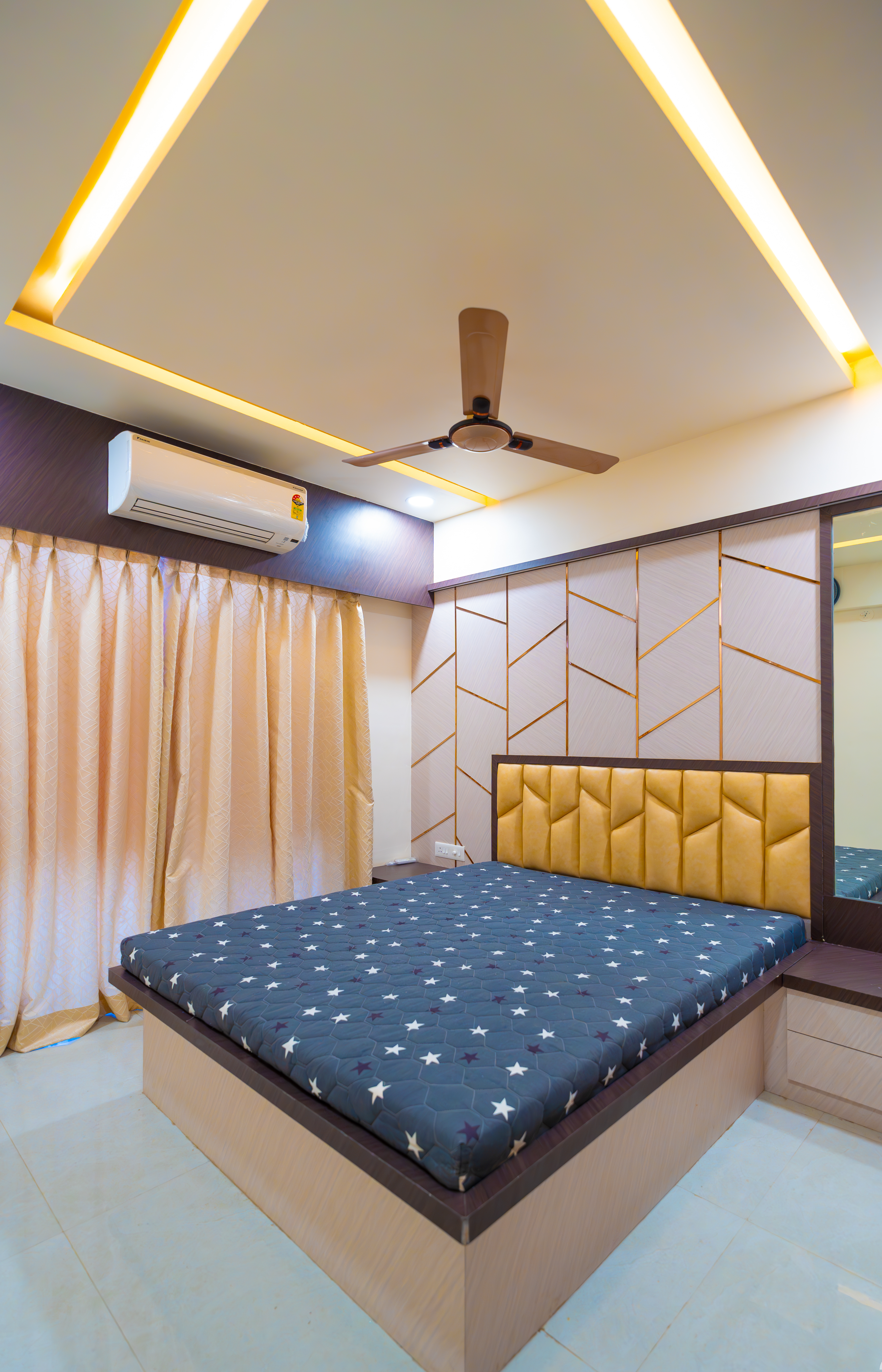 A bold bedroom concept with statement headboard and ceiling design, bringing a premium visual identity.
