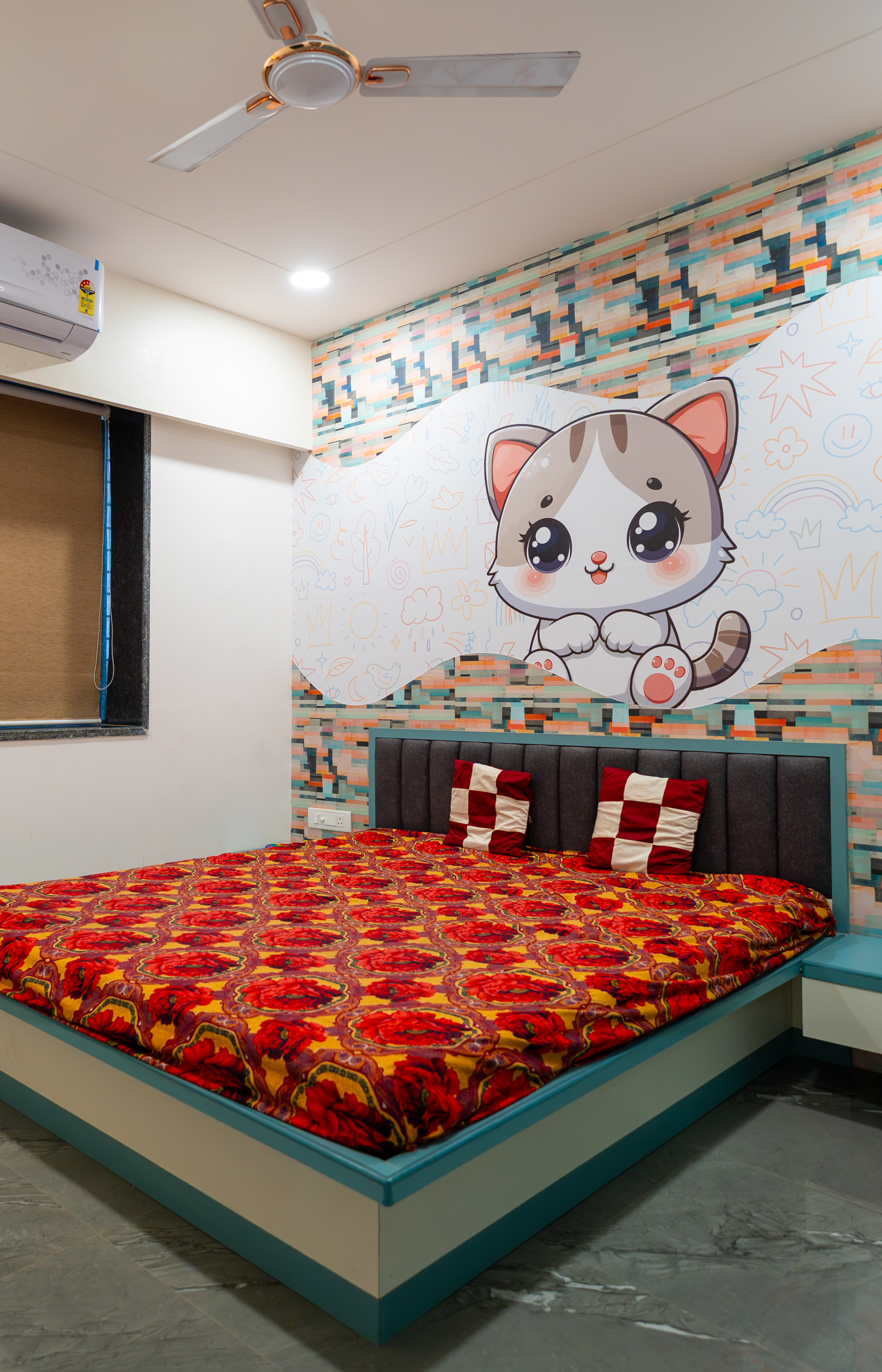 A vibrant and playful bedroom design with custom wall graphics, creating a fun and personalized space.