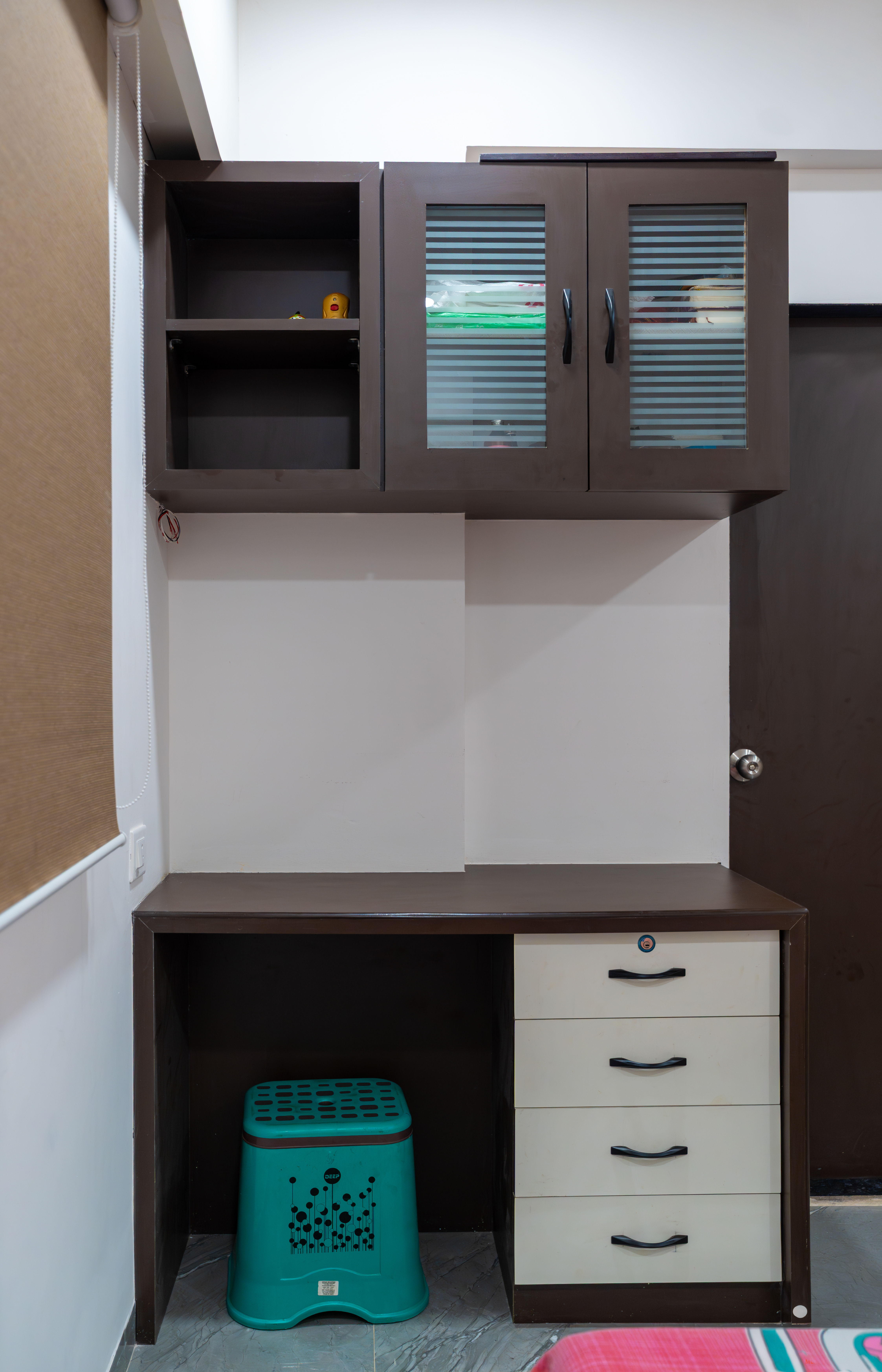 A compact study unit designed for productivity, integrating storage and workspace in a clean layout.