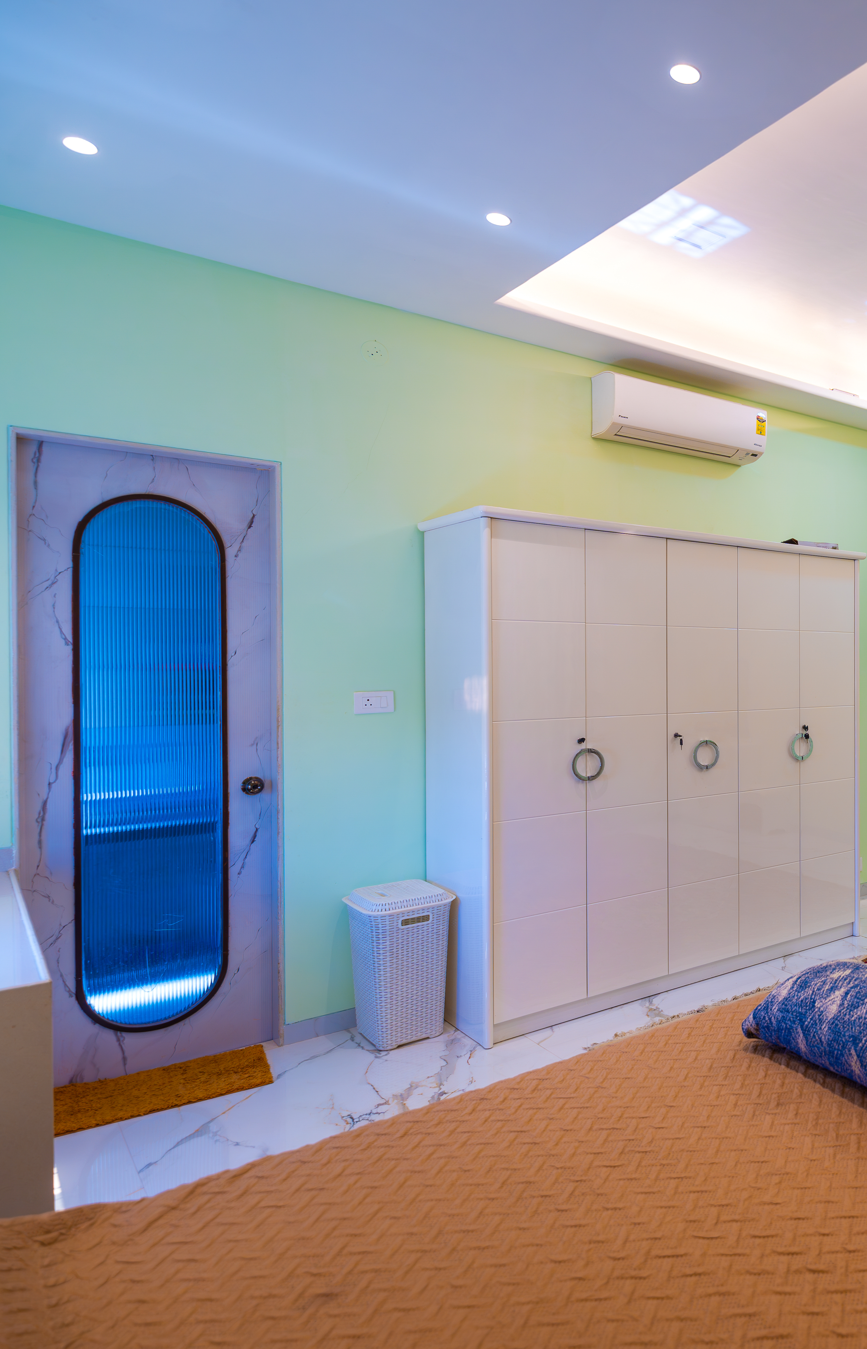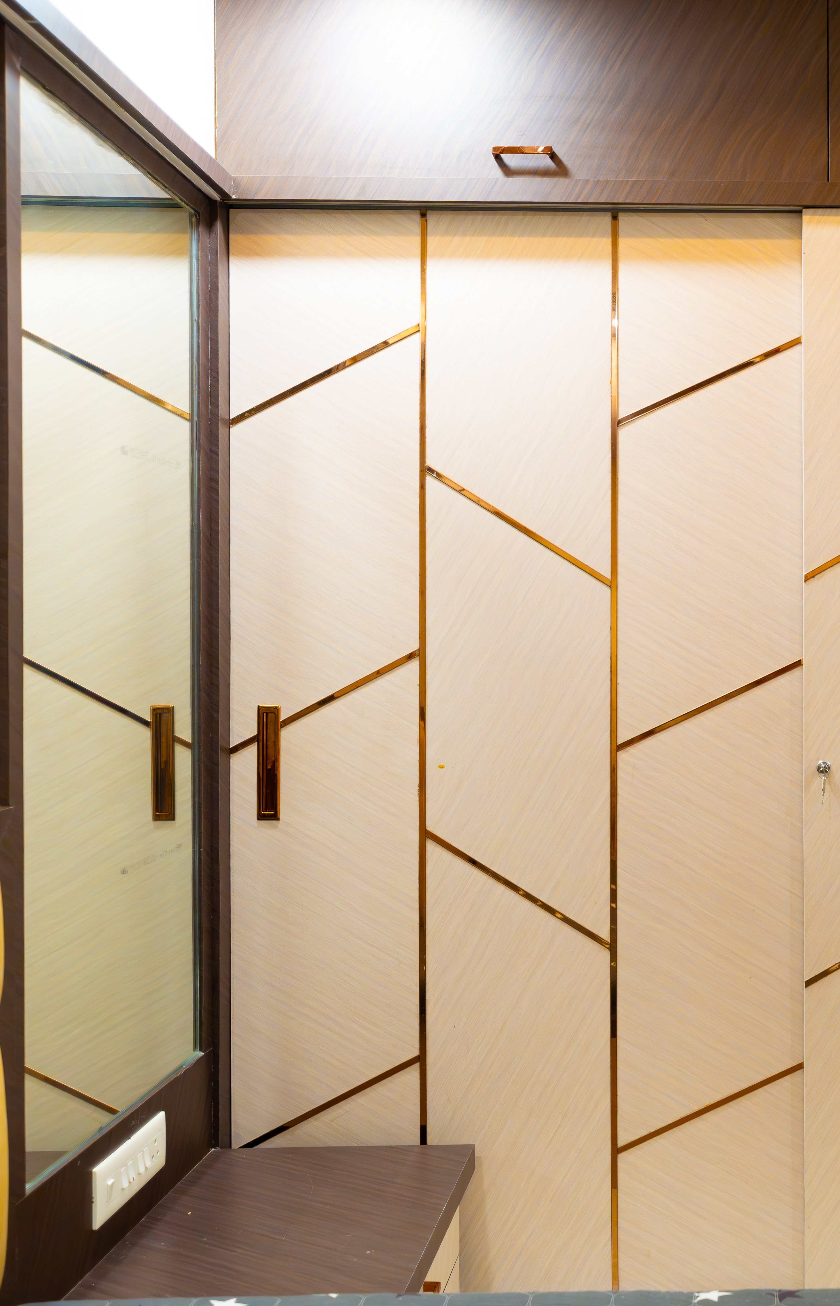 A clean wardrobe setup paired with a unique entry design, enhancing both storage and visual appeal.