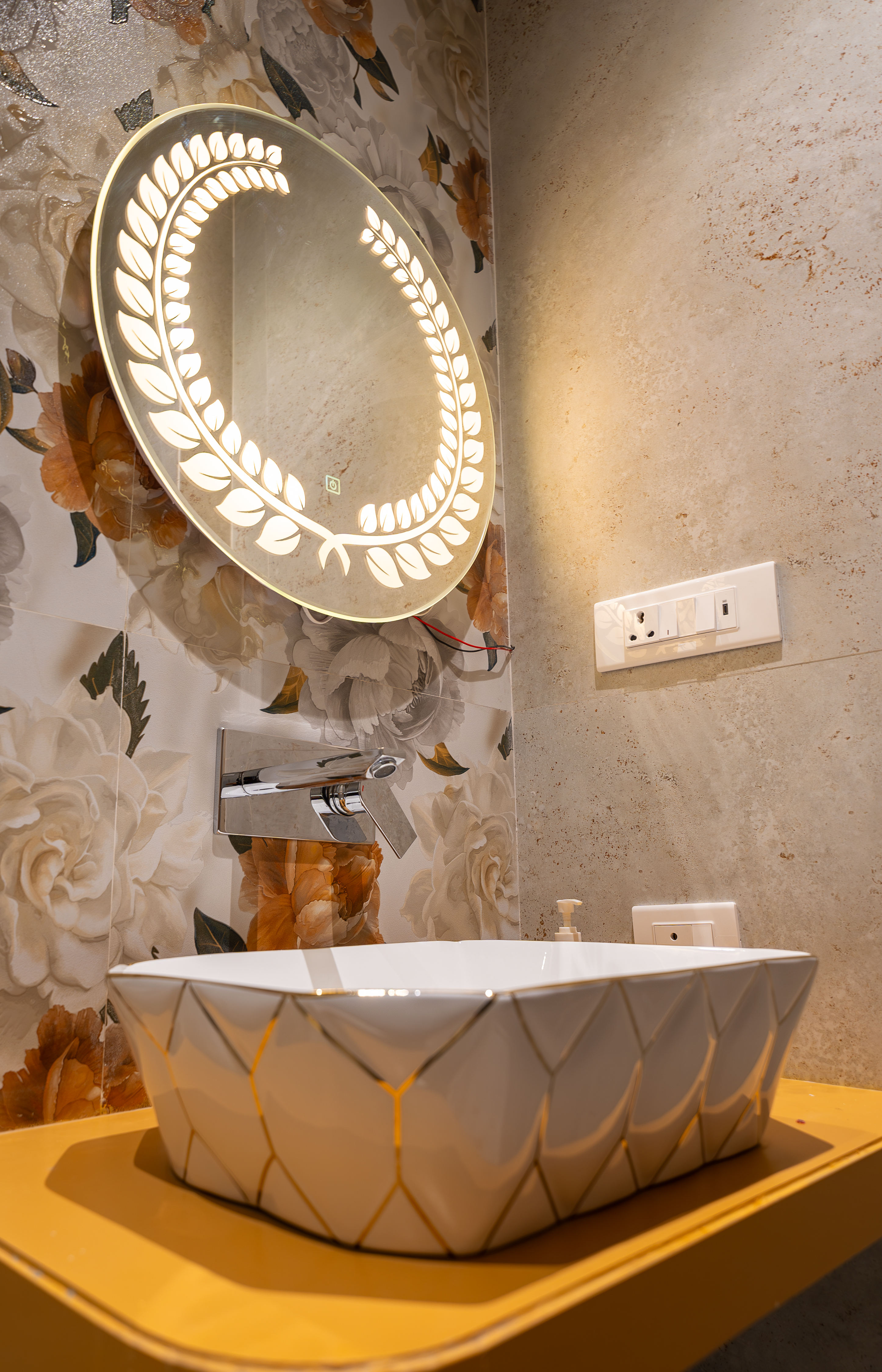 A stylish vanity setup with designer mirror and textured backdrop, adding a touch of luxury.