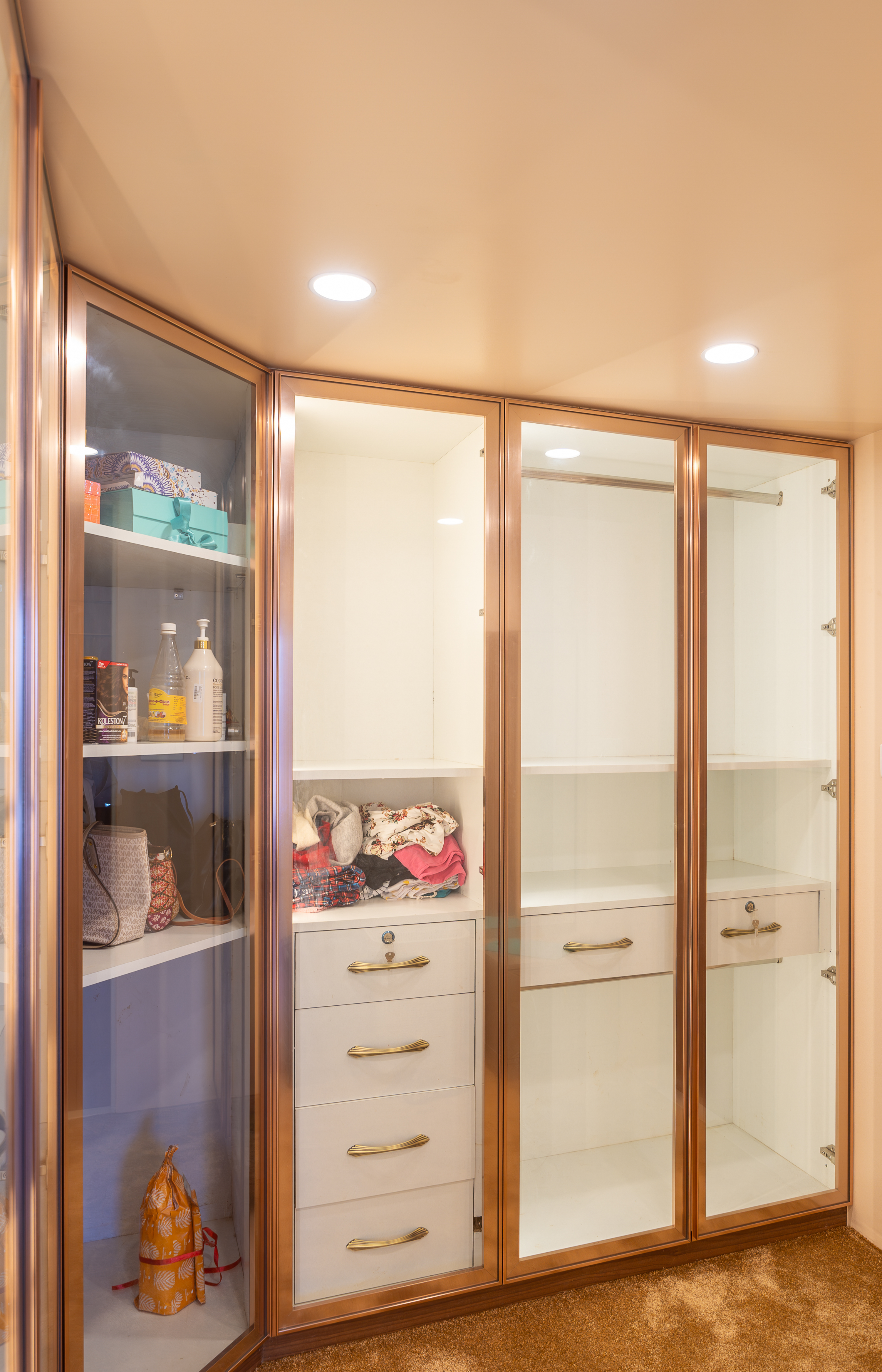 A well-organized wardrobe space with glass shutters and integrated storage solutions.