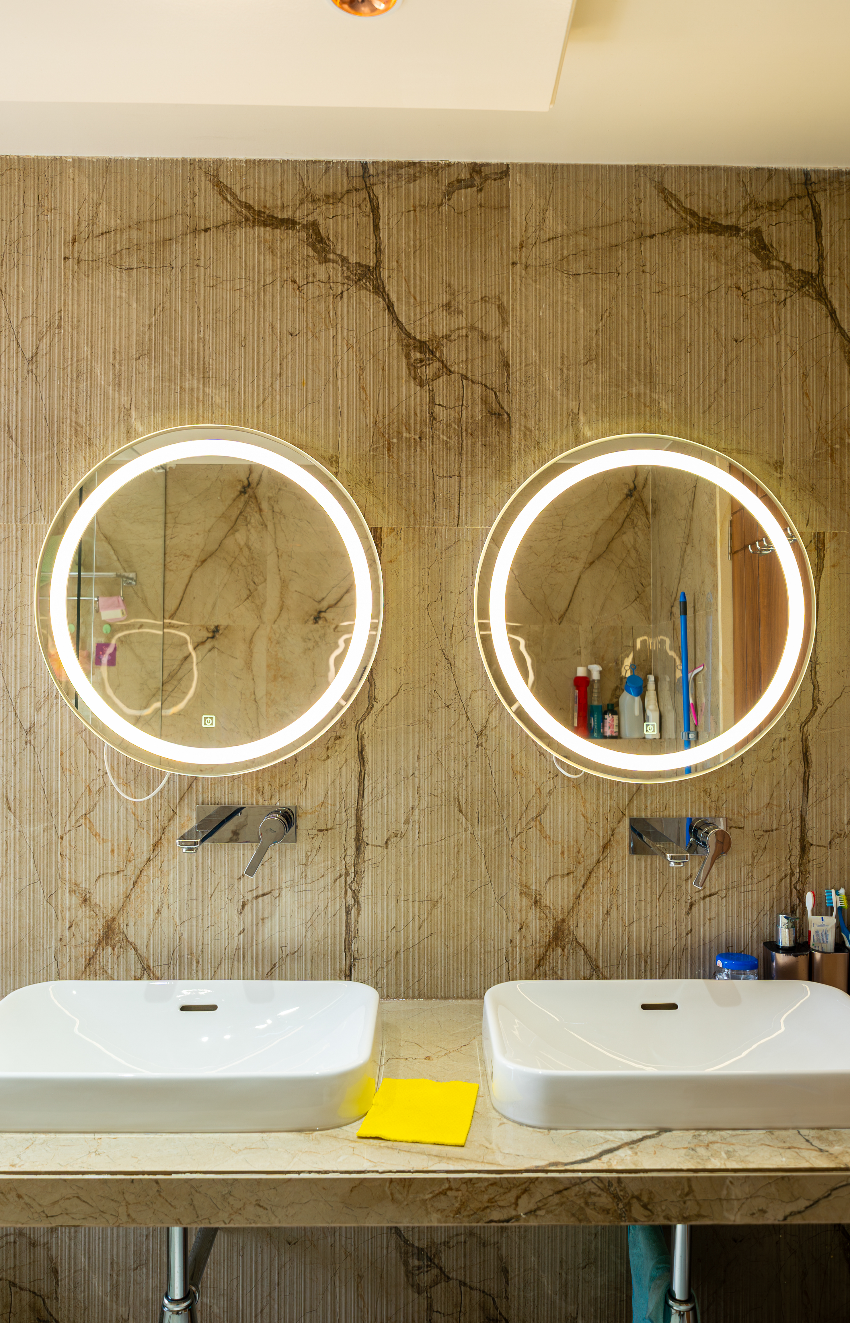 A luxurious double vanity with backlit mirrors and textured surfaces, enhancing both function and design.