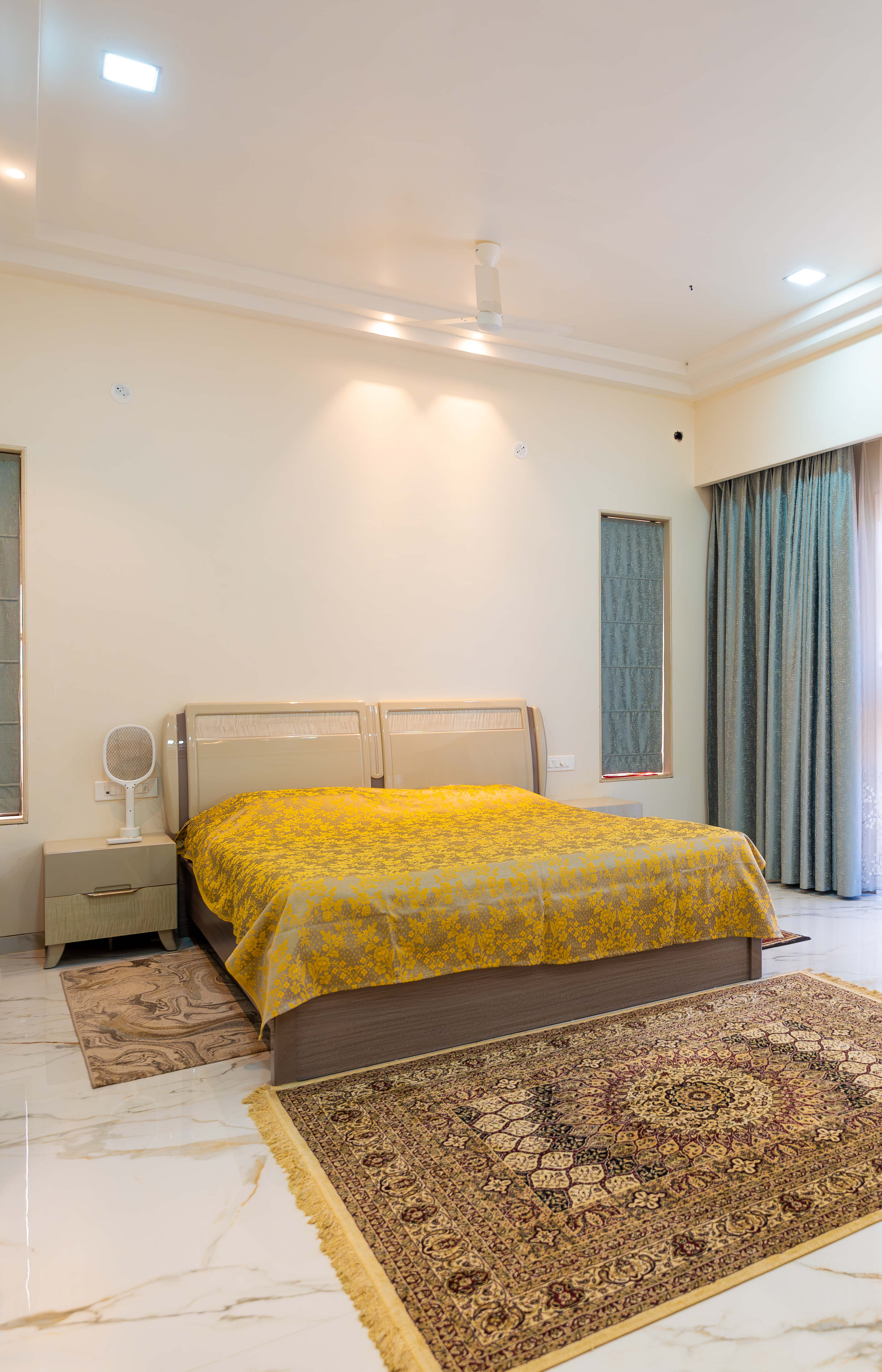 A large bedroom designed with minimal elements, focusing on space, comfort, and subtle elegance.