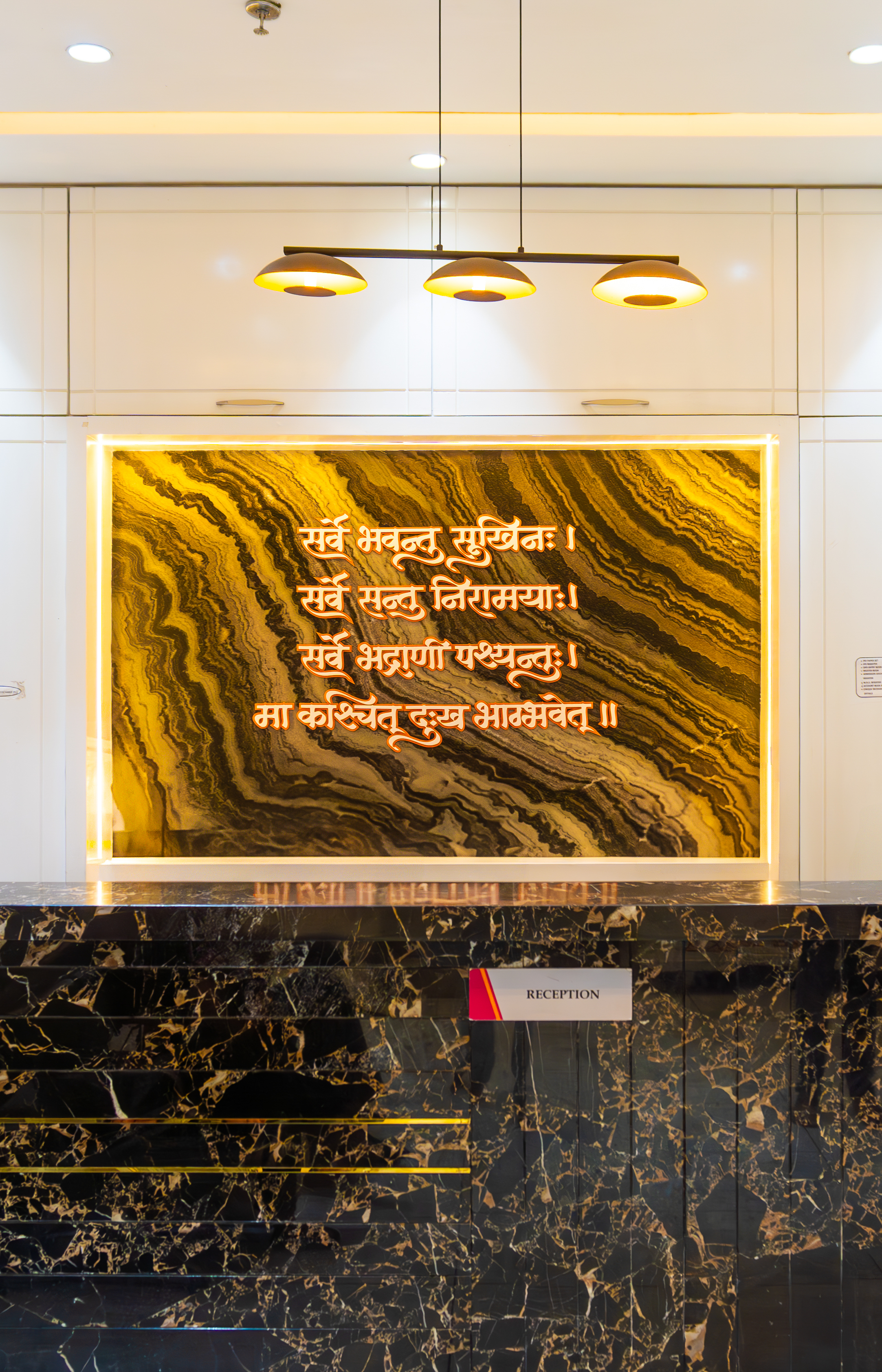 A statement entry foyer with textured wall finishes and warm lighting, setting a refined tone from the moment you enter.
