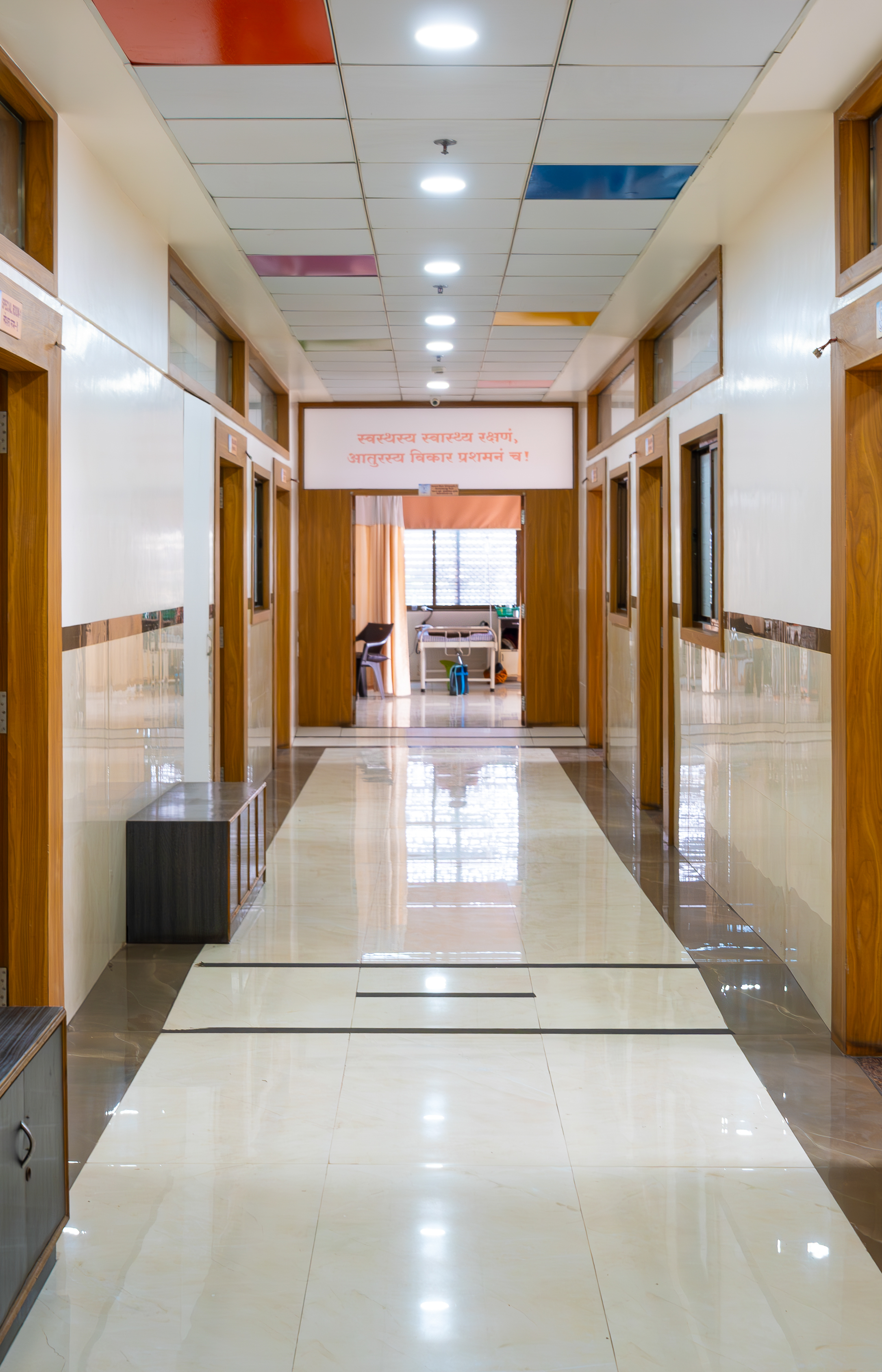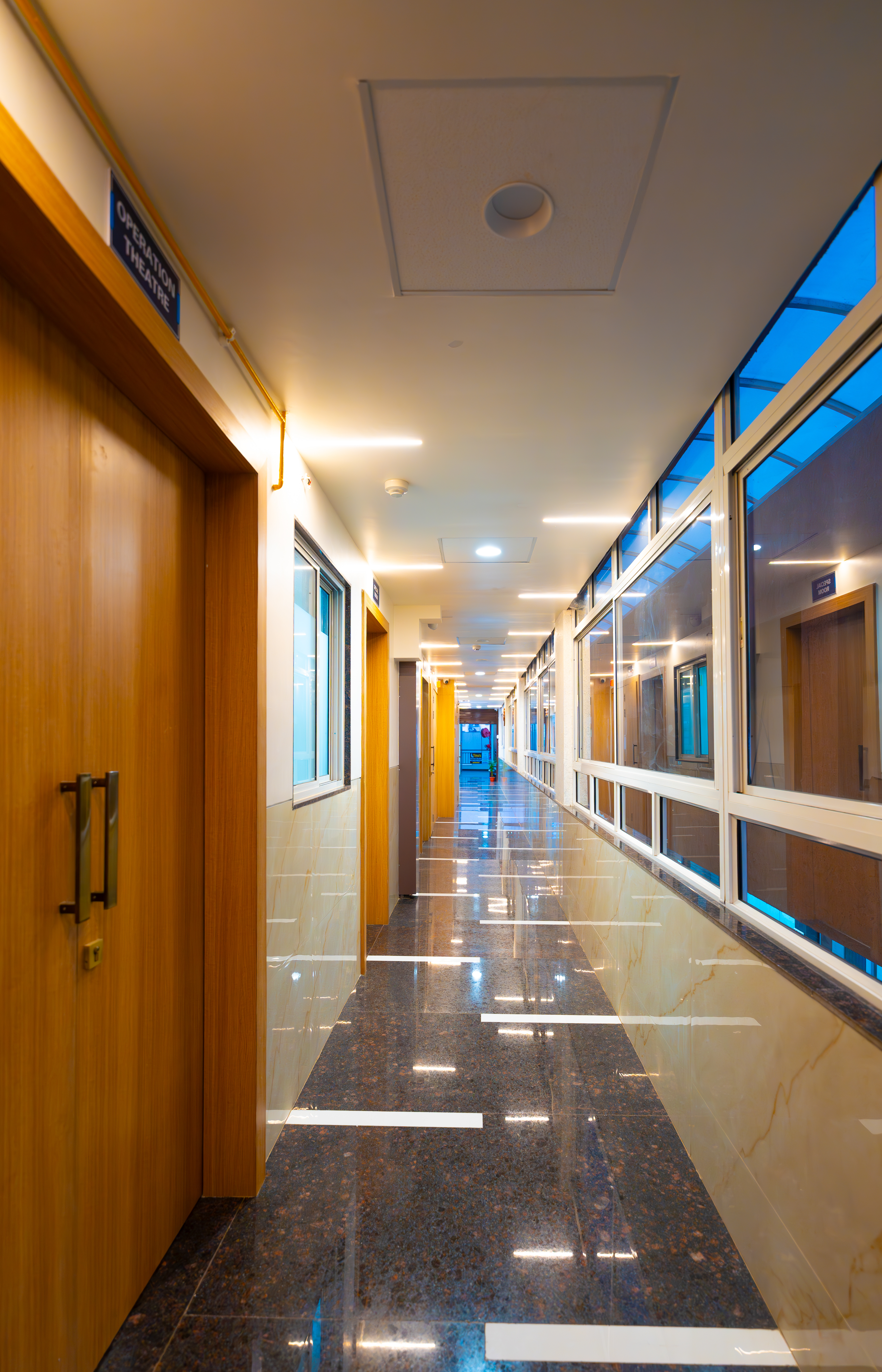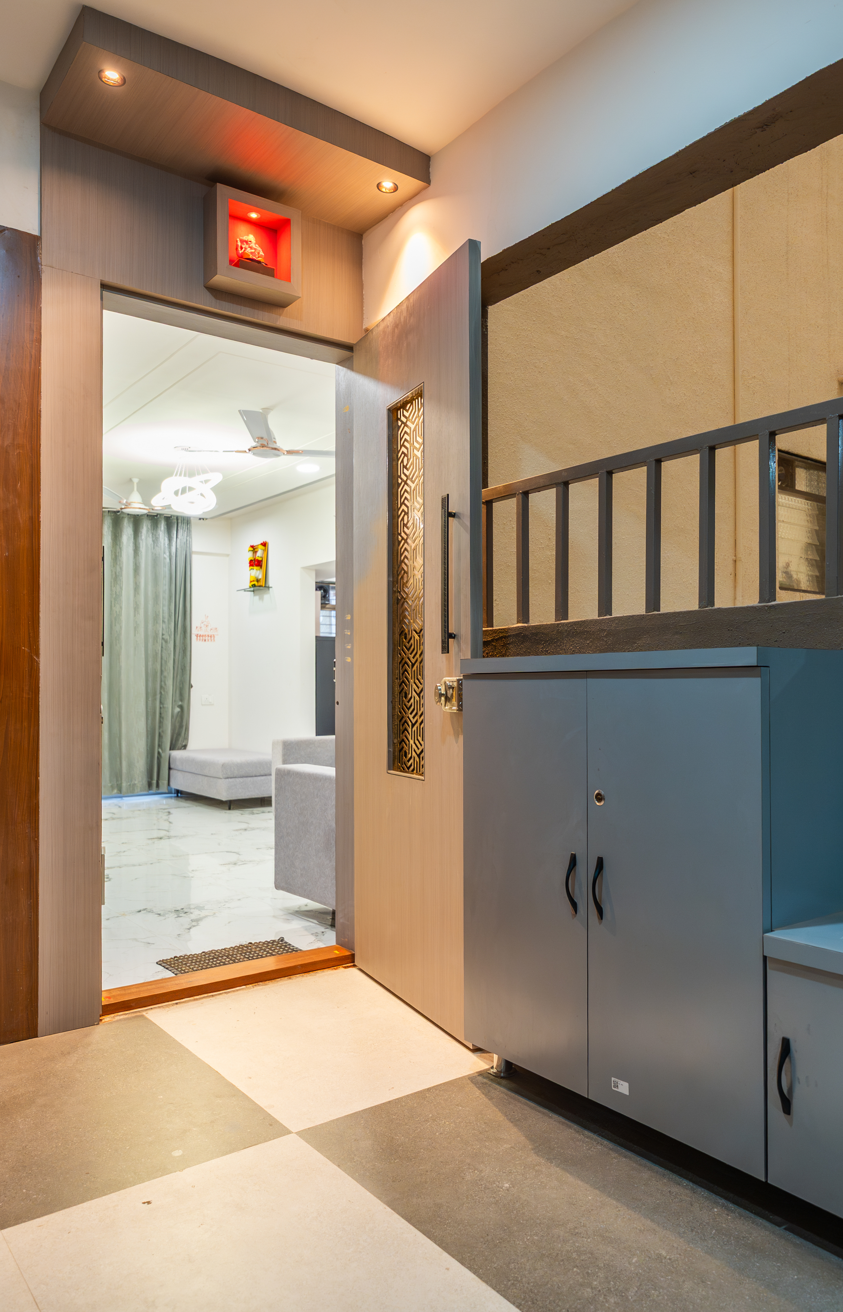 A custom-designed main door with intricate panel work, adding character and a strong first impression.