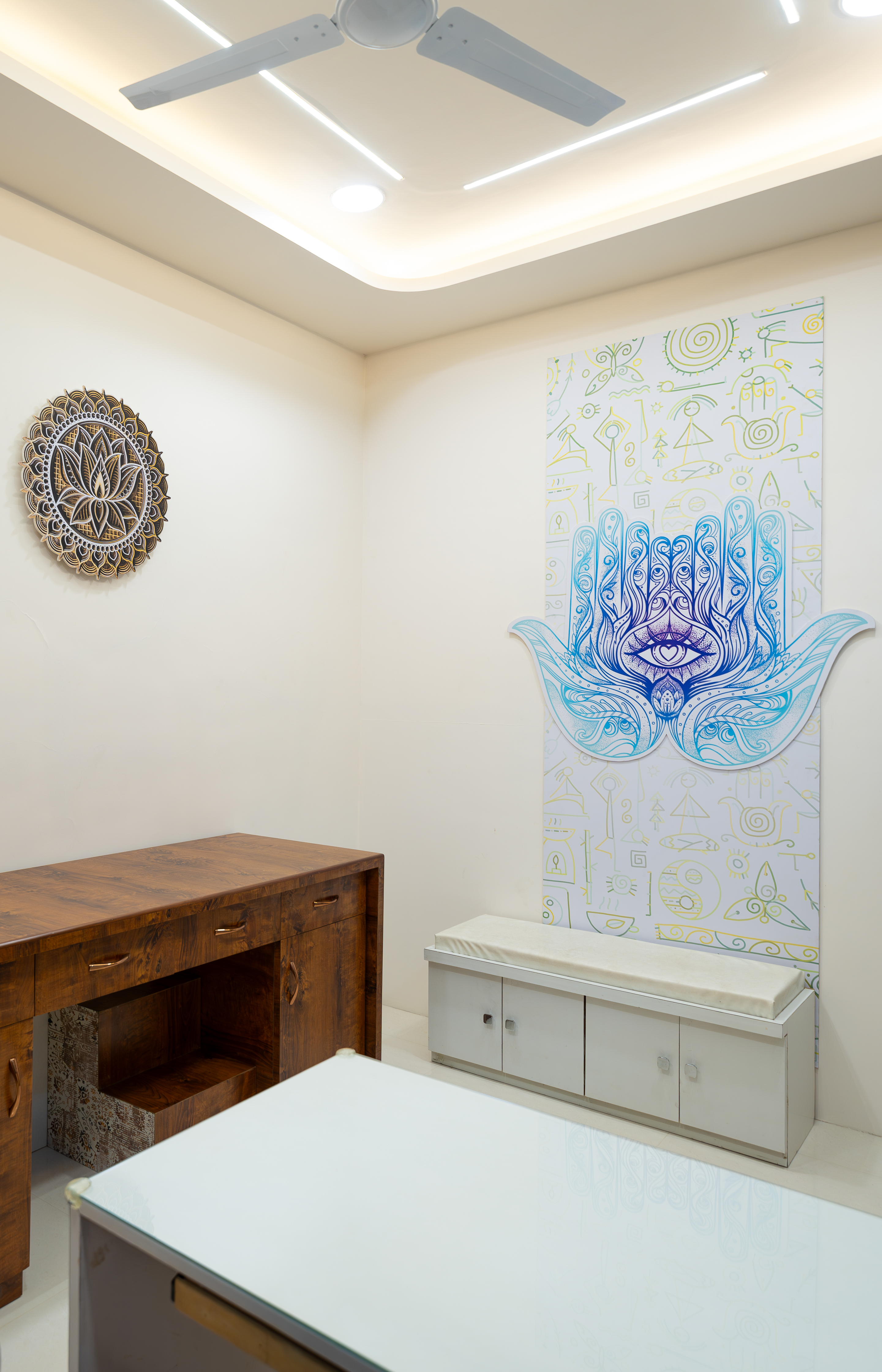 A stylish vanity setup with designer mirror and textured backdrop, adding a touch of luxury.