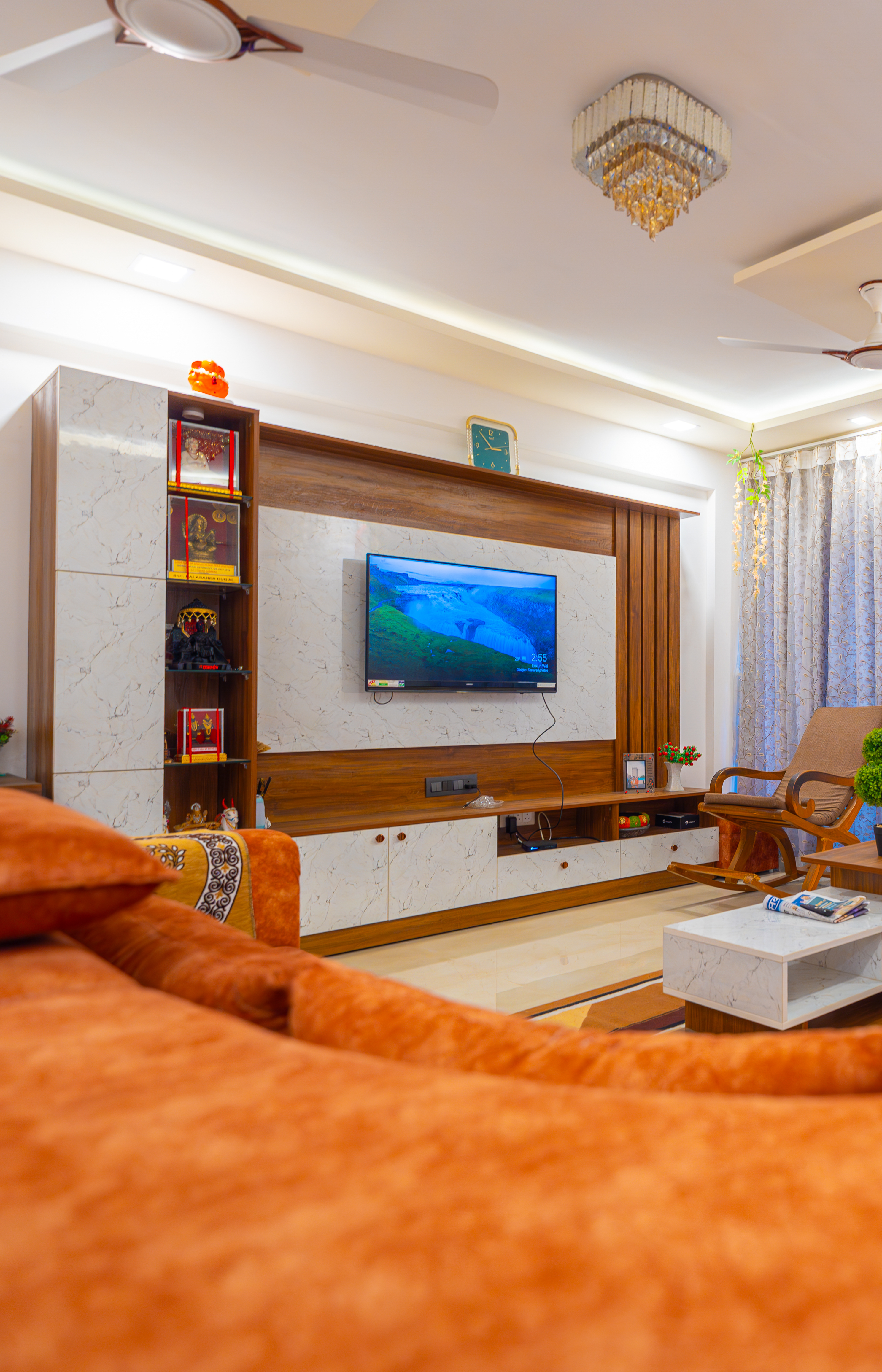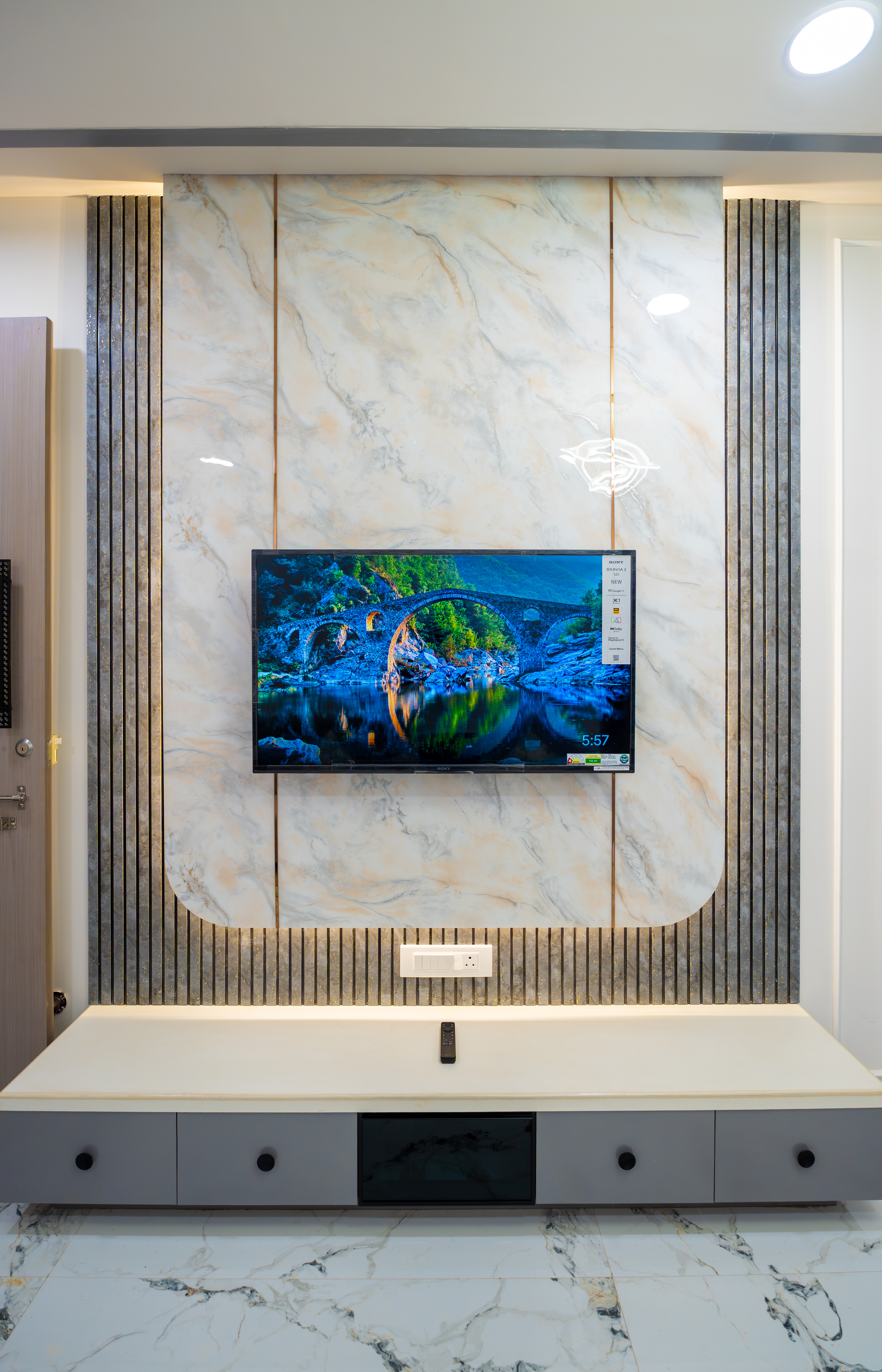 A refined TV unit with marble-finish backdrop and subtle lighting, adding a premium focal point to the living area.