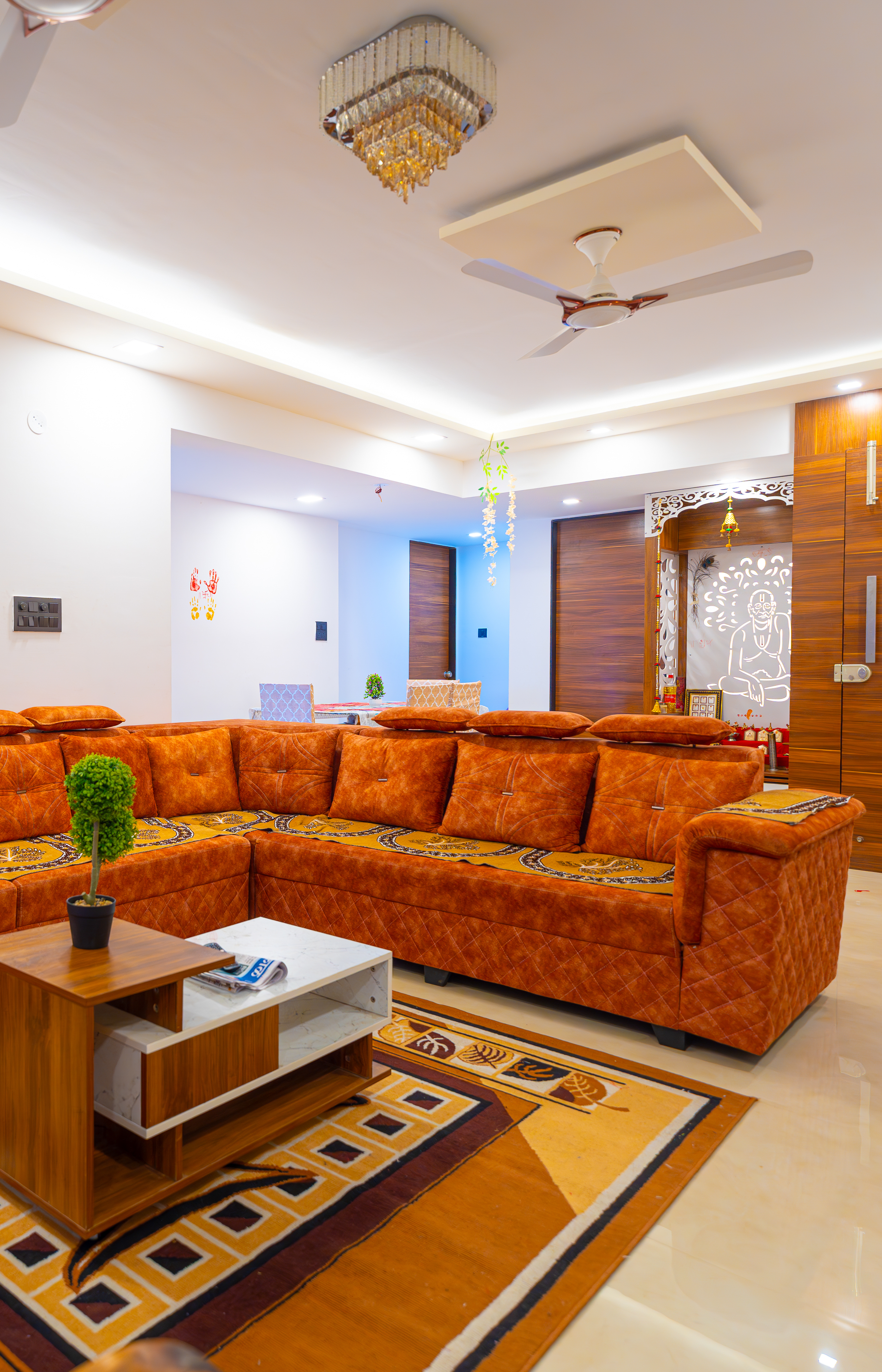 A spacious seating arrangement that balances elegance and openness for everyday and guest use.