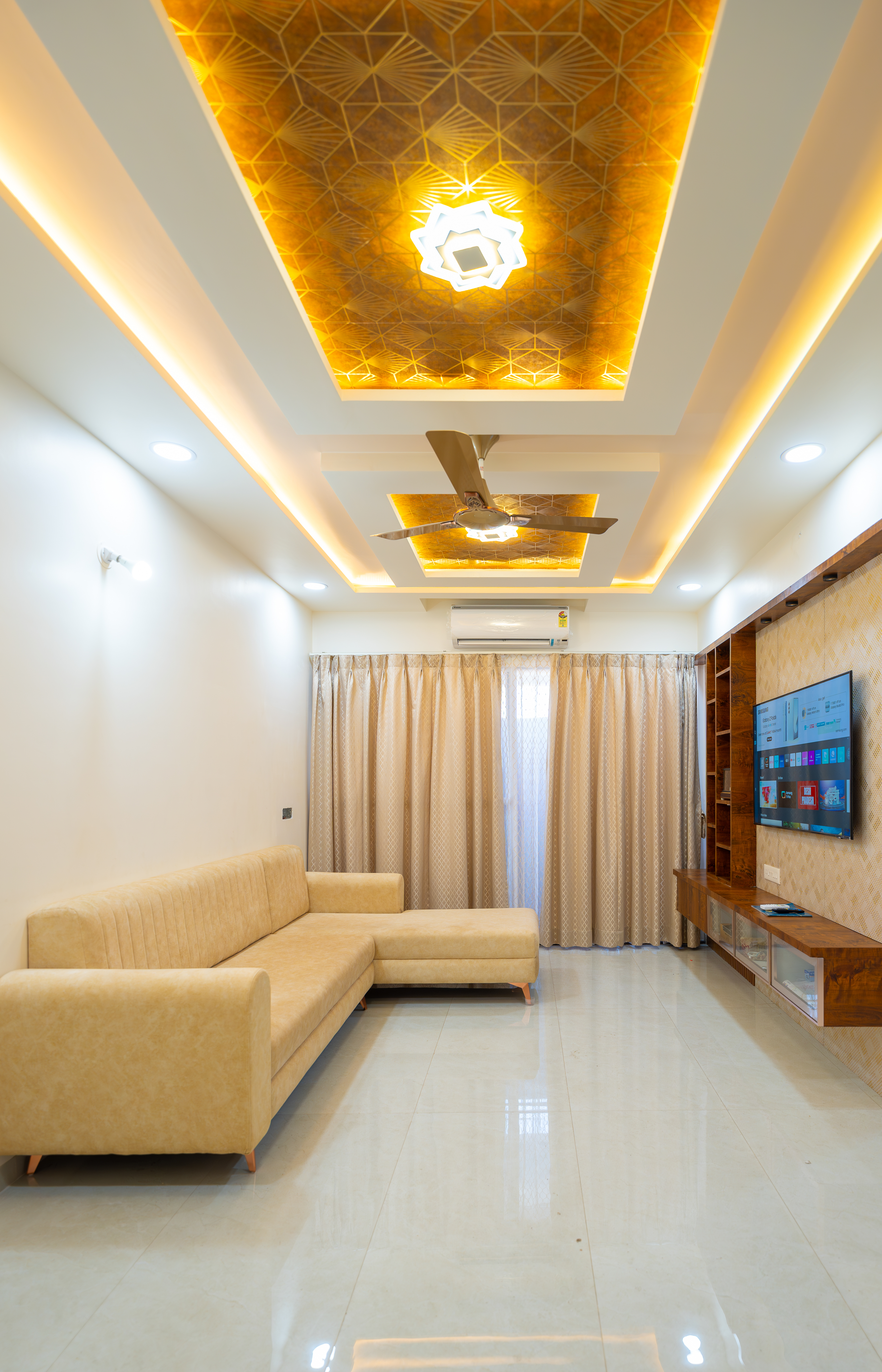 A spacious living area enhanced with layered ceiling lighting and warm tones, creating a luxurious and inviting ambiance.
