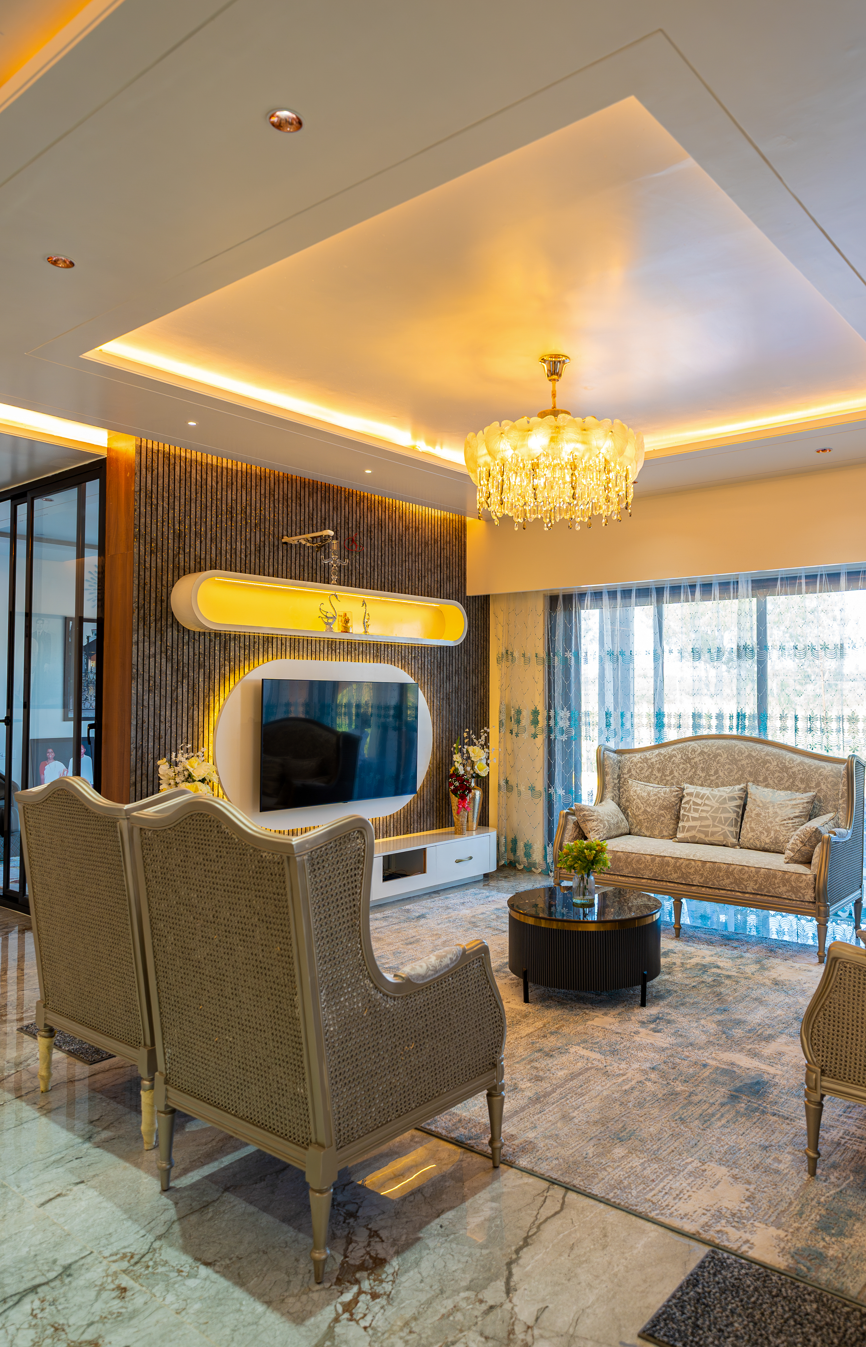 An elegant living lounge designed with classic seating, layered ceiling lighting, and a central chandelier that enhances the space’s luxurious ambiance.